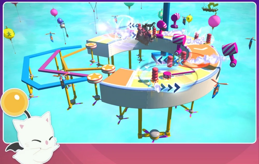 Eine etwas fröhlichere Kollaboration gibt es wiederkehrend im Gold Saucer mit dem Event Stolperville, in dem 24 Spieler in einer Reihe an bonbonfarbenen Hindernisrennen basierend auf Fall Guys gegeneinander antreten. Wie es sich für ein Battle Royale gehört, stolpern sie durch mehrere Level, bei denen immer weitere Spieler eliminiert werden, um Manderville Gold Saucer Ruhm zu sammeln und die Krone zu ergattern.