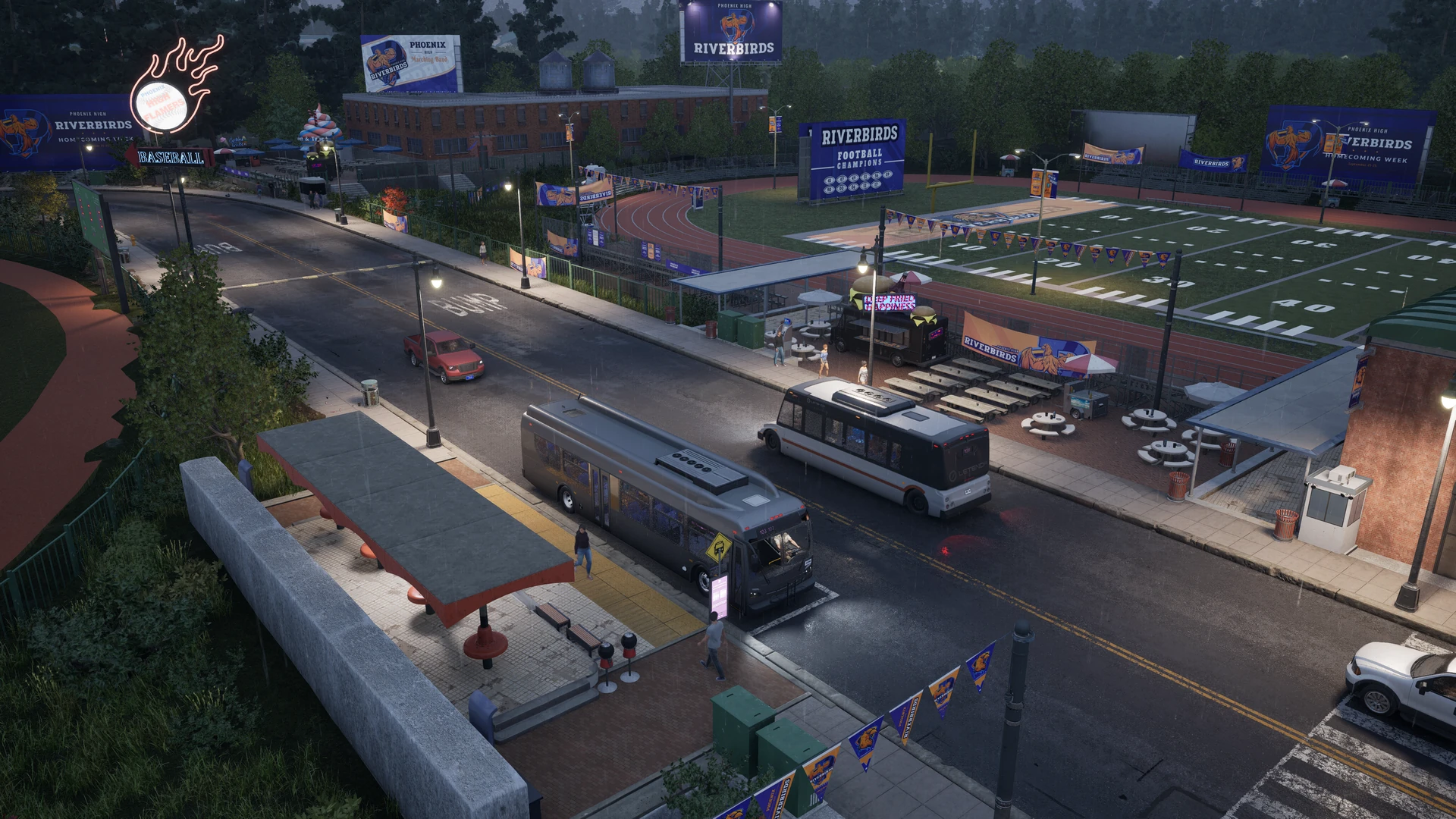 Auch optisch weiß Bus Bound zu überzeugen und liefert uns tolle Lichteinfälle, einen stimmungsvollen Tag- und Nachtwechsel sowie dynamisches Wetter. Beides ist übrigens nicht nur optischer Natur, sondern beeinflusst auch das Spielerlebnis. So hat die Tageszeit Einfluss darauf, wo die Passagiere hin gefahren werden möchten, sodass nachts zum Beispiel mehr Bedarf für Fahrten zu den Clubs der Stadt ist. Auch die Anzahl der Passanten in den Bezirken hängt von der Tageszeit ab. Das Wetter hat wiederum Einfluss auf das Tempo des Verkehrs, wodurch bei Regen beispielsweise alles langsamer abläuft, dafür aber auch weniger los ist. Die Stadt an sich kann in Sachen Atmosphäre und Abwechslung ebenfalls punkten und sorgt mit zahlreichen Sehenswürdigkeiten, sichtbar unterschiedlichen Bezirken mit individueller Architektur und eigenen Hotspots sowie zahlreichen detailliert umgesetzten Dekorationen für eine sehenswerte Kulisse. Randbezirke fühlen sich zum Beispiel völlig anders an als das pulsierende von Hochhäusern geprägte Herz der Innenstadt oder die grünen Parks am Stadtrand. Auch die Charaktermodelle sehen ordentlich aus ebenso wie die verschiedenen Busse, bei denen es sich um offiziell lizenzierte Fahrzeuge handelt, aber eben um amerikanische und nicht um deutsche. Marken wie Horizon, New Flyer oder Blue Bird dominieren hier den Fuhrpark. Ebenfalls zur Atmosphäre trägt der chillige Soundtrack bei, der uns mit lockeren Instrumentalstücken die Fahrten versüßt und für eine entspannte Grundstimmung sorgt. Gleiches gilt für die sehr ordentlich auf Deutsch vertonten Gespräche, die unsere Vorgesetzten mit uns führen.