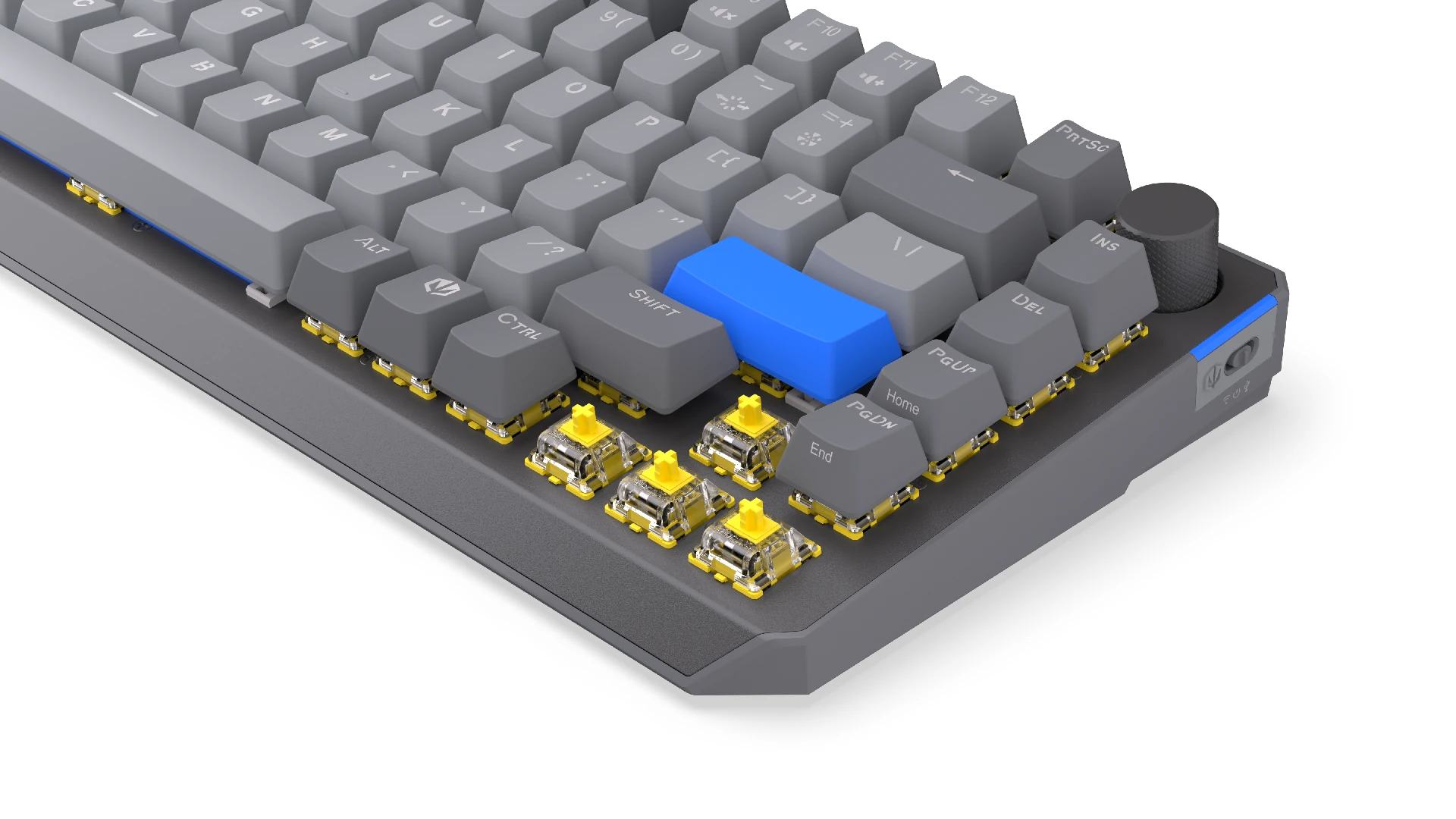 Schon beim ersten Anfassen wird klar, dass die Endorfy Thock V2 75 % Wireless kein billiges Leichtgewicht ist. Das Gehäuse besteht zwar aus Kunststoff, wirkt aber hochwertig verarbeitet und angenehm stabil. Es gibt kein Knarzen, kein Nachgeben und auch bei stärkerem Druck bleibt alles dort, wo es sein soll. Das Gewicht ist gut gewählt. Die Tastatur bleibt zuverlässig an Ort und Stelle, ohne dabei zu schwer zu wirken. Gerade im kabellosen Einsatz ist das ein angenehmer Mittelweg, da sie sich bei Bedarf auch problemlos umpositionieren lässt. Das 75 %-Layout erweist sich im Alltag als sehr durchdacht. Man verzichtet auf den klassischen Nummernblock, bekommt aber dennoch nahezu alle wichtigen Tasten. Besonders beim Gaming fällt der zusätzliche Platz auf dem Schreibtisch positiv auf, da die Maus mehr Bewegungsfreiheit hat. Optisch liefert Endorfy ebenfalls ab. Die RGB-Beleuchtung ist gleichmäßig, ausreichend kräftig und lässt sich vielseitig einsetzen. Sie wirkt nicht überladen, sondern kann sowohl dezent als auch auffällig eingestellt werden. Dadurch passt sich die Tastatur problemlos unterschiedlichen Setups an. Ein praktisches Detail ist der integrierte Lautstärkeregler. Dieser sitzt gut erreichbar und erleichtert den Alltag spürbar. Gerade beim schnellen Anpassen der Lautstärke während eines Spiels oder beim Wechsel zwischen Musik und Voice-Chat merkt man schnell, wie angenehm diese Lösung ist.