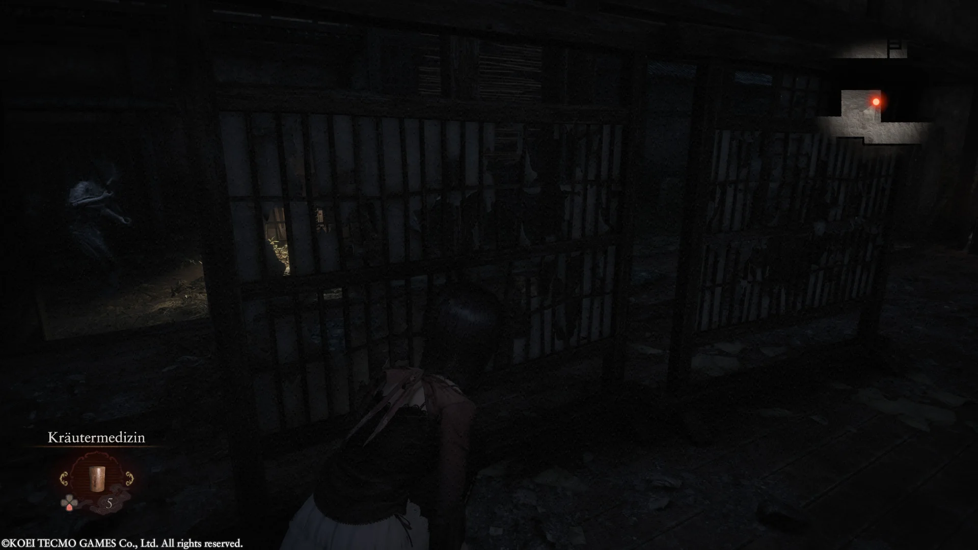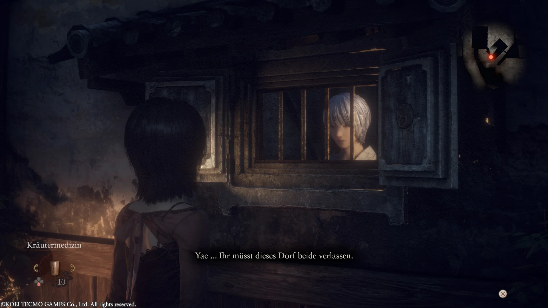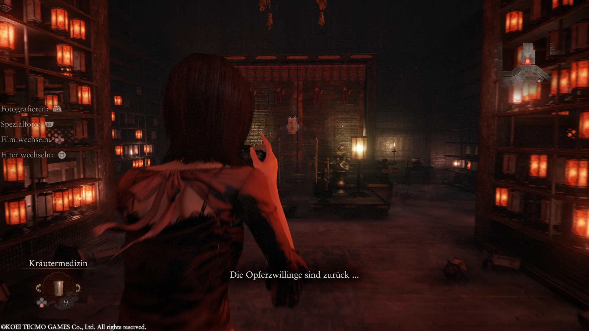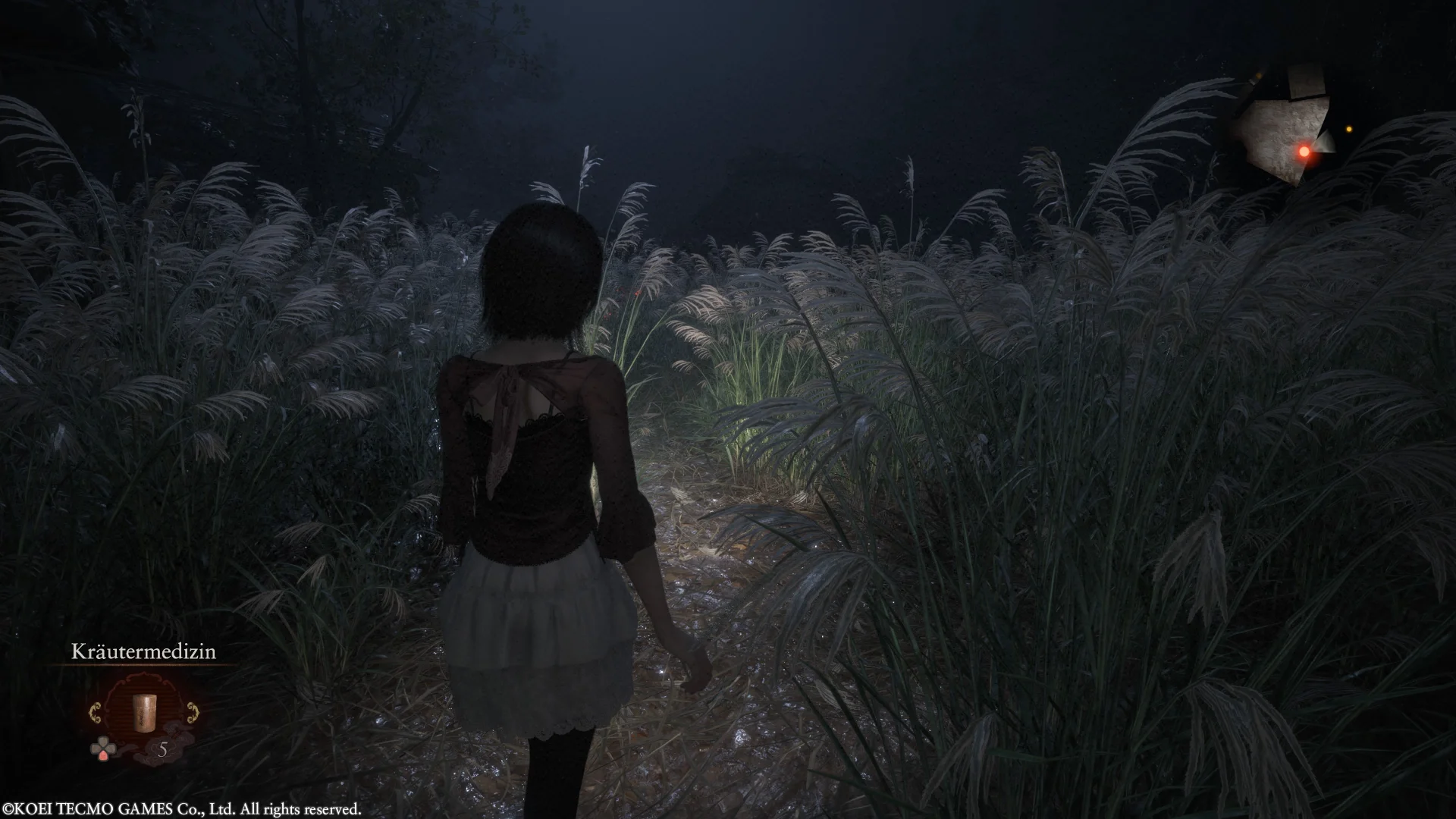 Gilt es unbemerkt zu bleiben, sollten wir als erstes unsere Taschenlampe ausschalten, damit der Lichtstrahl den Geist nicht direkt zu uns führt. Weiterhin müssen wir uns leise verhalten. Mio kann im Vergleich zur Ursprungsversion nun endlich einmal richtig rennen, statt nur sehr langsam und gemächlich vor sich hin traben. Um verborgen zu bleiben, sollten wir aber direkt einen Gang runter schalten. Ergänzend verfügt unsere Protagonistin in der Hocke über einen Schleichmodus, der nochmals unauffälliger ist. Verstecke, in die Mio sich verkriechen kann, bis der Feind von dannen gezogen ist, runden das Portfolio ab. Sollten wir aus unserem Versteck heraus die Lage nicht eindeutig überblicken können, weil wir nicht nur sprichwörtlich ein Brett oder eine Stoffbahn vorm Kopf haben, kann ein Blick über die Anzeige unserer Kamera zeigen, ob sich der Geist noch in der Nähe befindet.