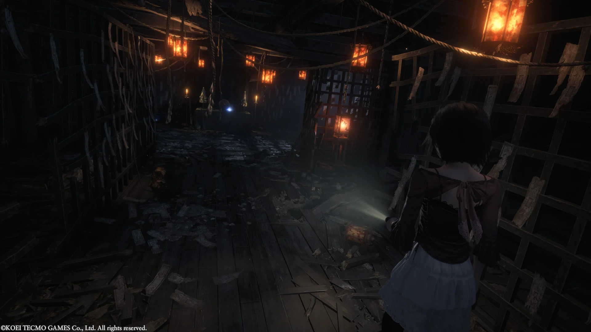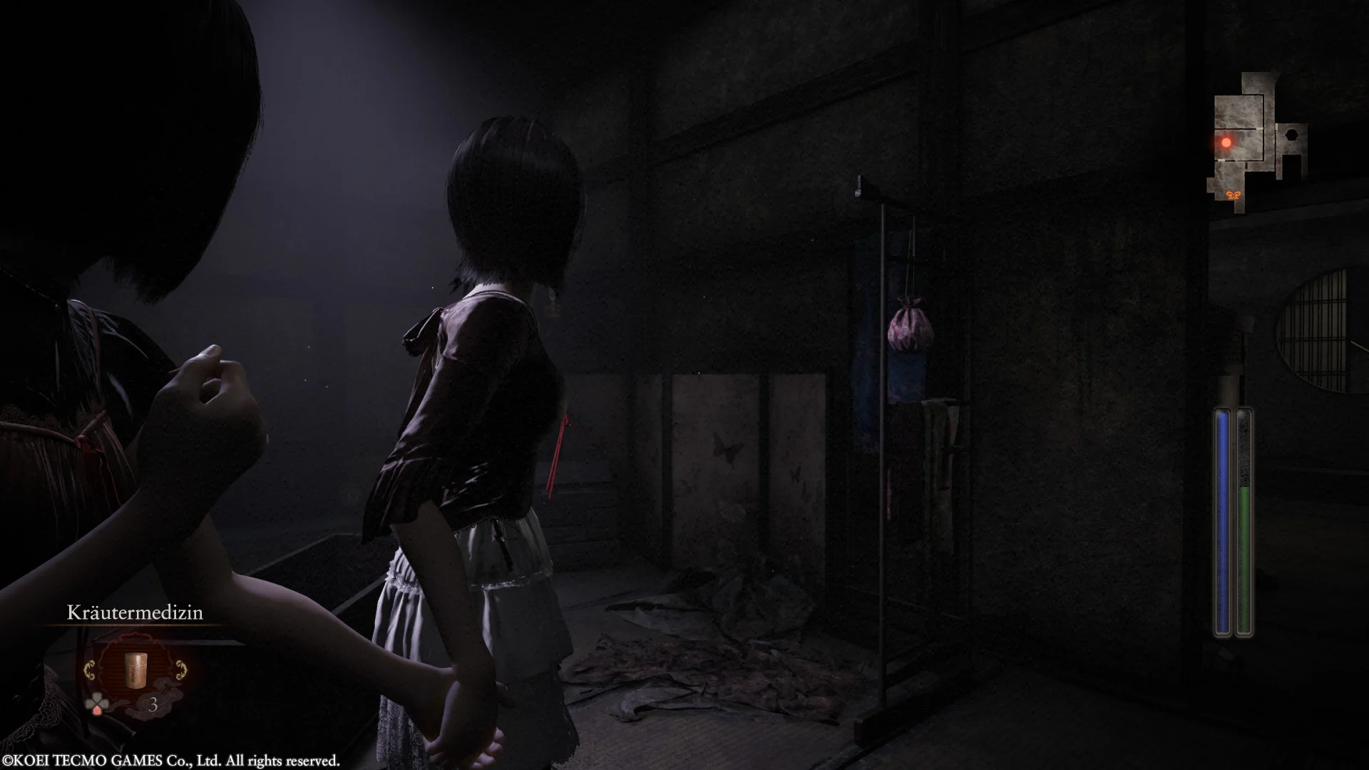 Erschreckt sich unsere Protagonistin oder wird von einem Geist berührt, verringert sich ihre Willenskraft und sie wird geschwächt sowie anfälliger für Angriffe. Schreckpotential bieten in der Umgebungserkundung Situationen wie das Öffnen von Türen und das bereits aus den Remaster bekannte Aufheben von Gegenständen. Hier kann es passieren, dass uns ein Geist per Jump Scare fixiert oder aus dem Nichts nach Mios Hand greift. Aber auch in den Kämpfen ist es möglich, dass uns der Geist plötzlich in sehr großer Nahaufnahme vor die Linse springt und Mio damit in Angst versetzt.