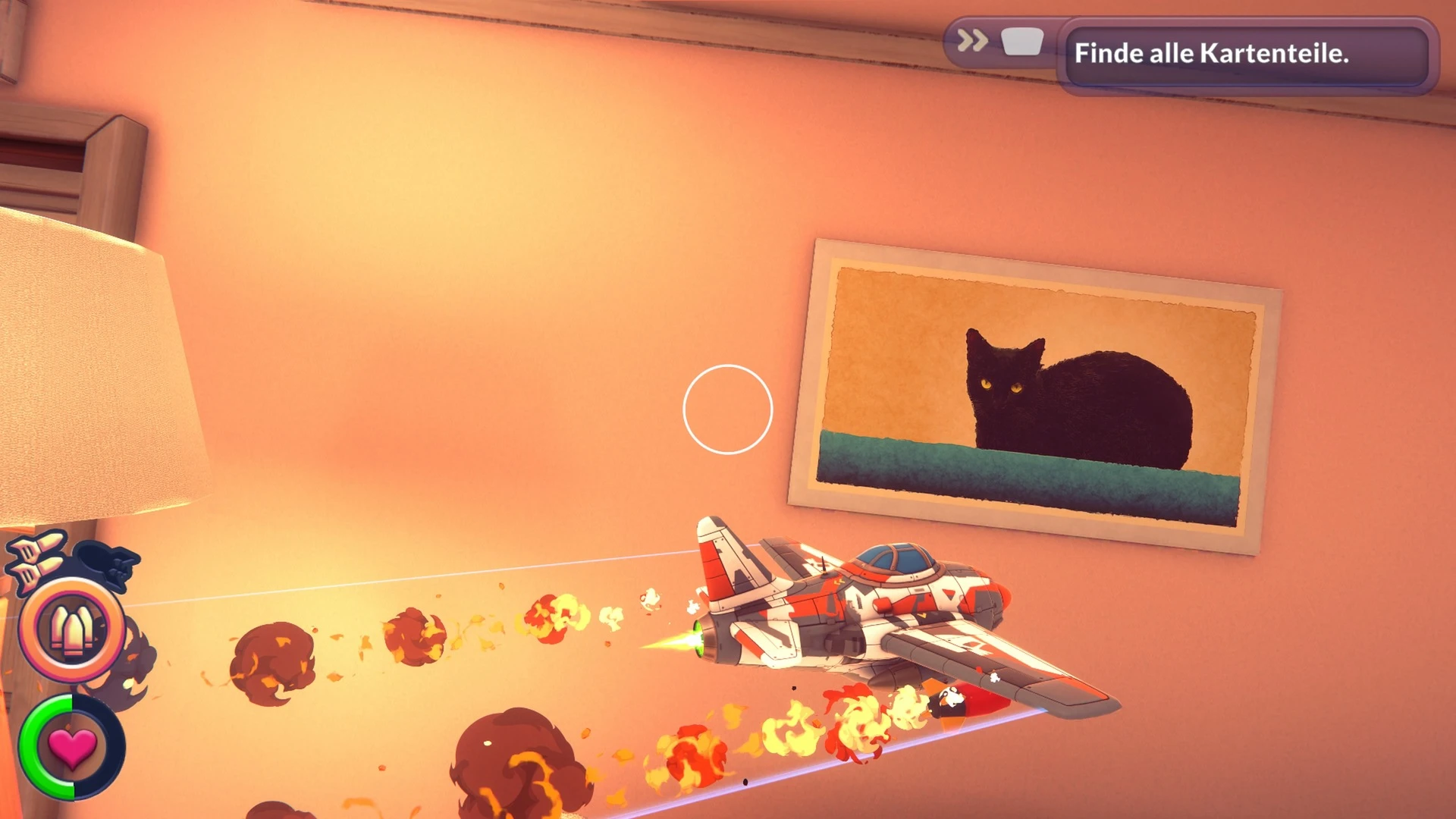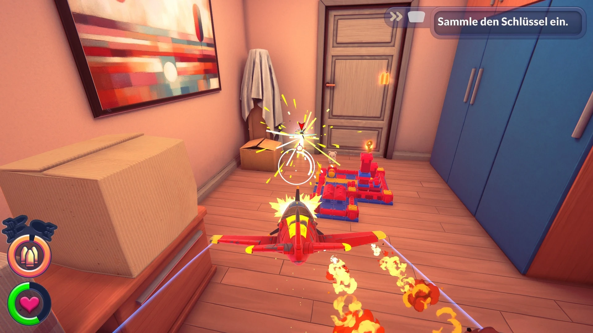 Stürzen wir doch einmal ab, so bietet das Spiel ein rudimentäres Checkpoint-System. Da die Missionen selten sonderlich lange ausfallen, hält sich der Frust in Grenzen. Ebenfalls sehr simpel gelöst sind Kollisionen mit der Umgebung. Da wir lediglich innerhalb des Hauses und der einzelnen Zimmer unterwegs sind, ist manövrieren manchmal gar nicht so einfach, auch wenn die Steuerung sehr schlicht ausfällt. Kollidieren wir doch einmal mit einer Wand oder einem Umgebungsobjekt, so erhalten wir Schaden. Wir können immerhin recht leicht auf der Stelle wenden, um die Folgeschäden möglichst gering zu halten. Um einen Strömungsabriss bei niedrigen Geschwindigkeiten brauchen wir uns also nicht zu sorgen.