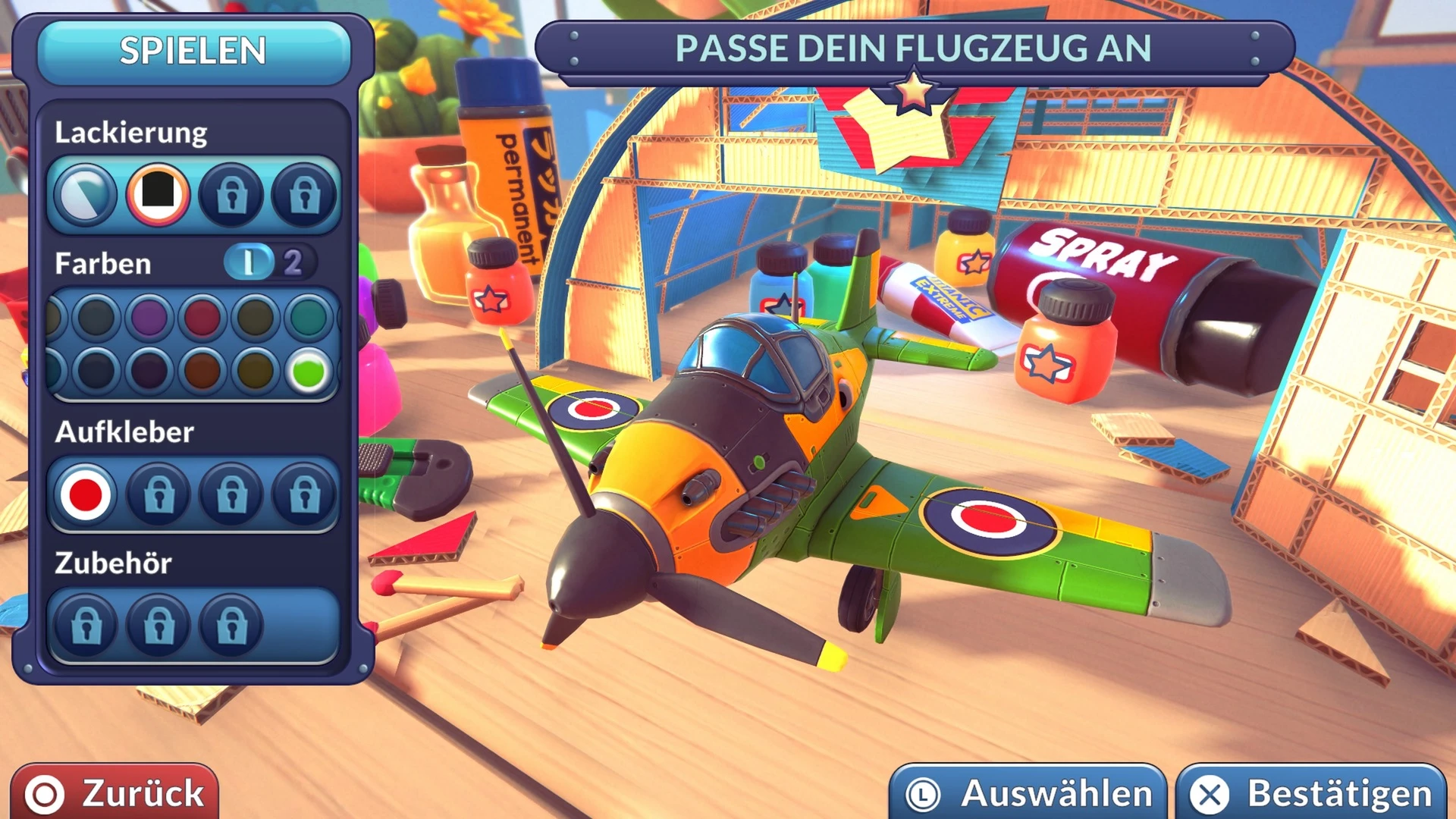 Und dann bietet House Fighters: Total Mess noch weitere Flugzeuge, die wir freischalten können. Prinzipiell lässt sich das Spiel gänzlich mit der Standard-Maschine bestreiten, doch spätere Flugzeuge bis hin zum futuristischen Prototypen haben deutlich bessere Flugleistungen und machen uns das Leben daher einfacher. Schön ist, dass wir für jedes Flugzeug ein eigenes Design abspeichern können, sodass man hier fleißig herumexperimentieren kann.