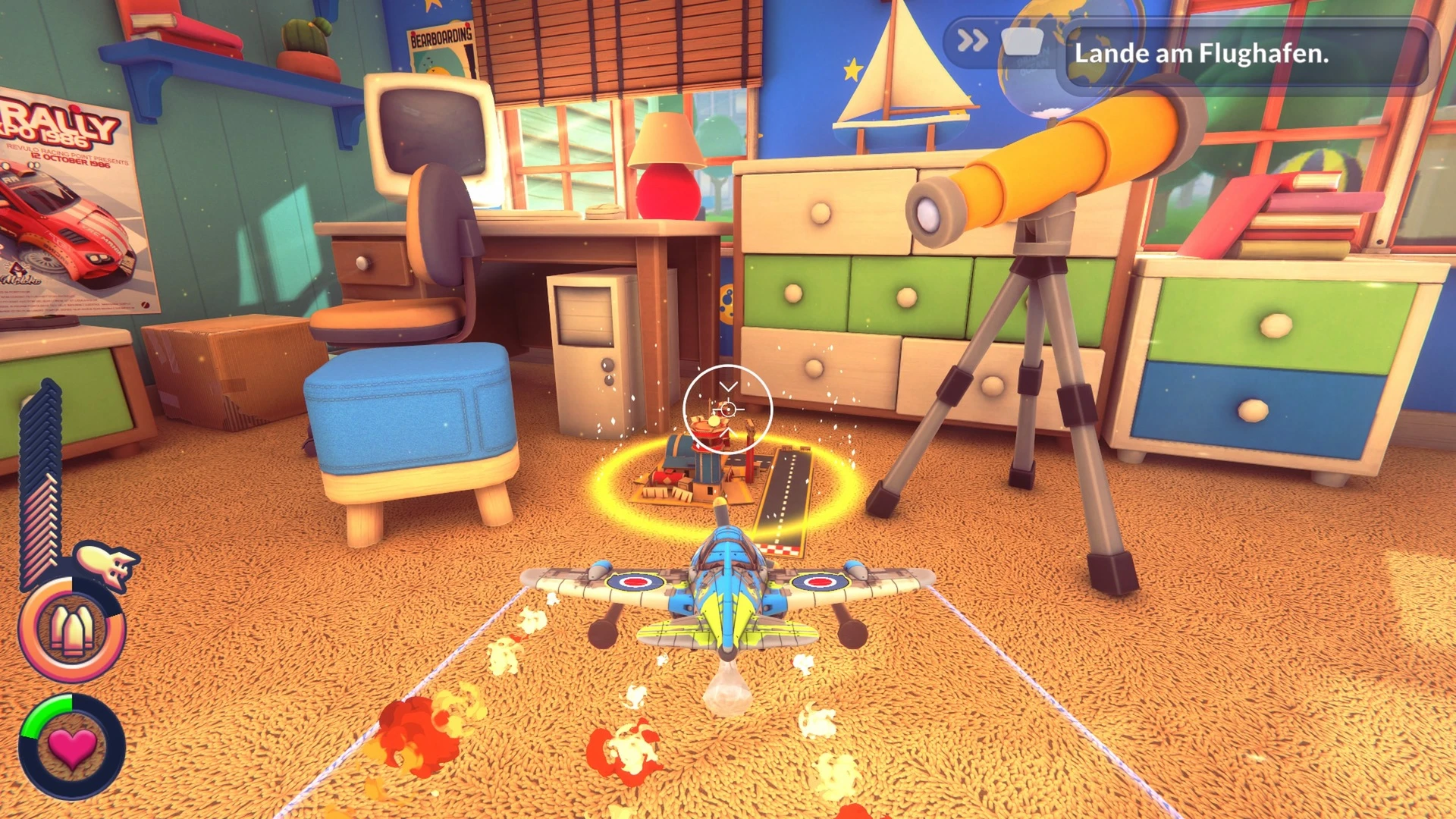 Die Story von House Fighters: Total Mess ist schnell erzählt. Fliegerass Lieutenant Green kehrt im Tutorial just dann zur heimischen Basis im Kinderzimmer zurück, als ein Angriff feindlicher Einheiten im Gange ist. Natürlich setzt Green alles daran, den bösen Angreifer Baron von Spielzeug zu vertreiben, was ihm schließlich gelingt. Fortan dient der kleine, aus Karton gefertigte Flughafen als Ausgangsbasis für unsere Abenteuer. Vom Kinderzimmer aus durchfliegen wir das durchaus geräumige Haus, welches wohl gerade in Teilen renoviert wird.