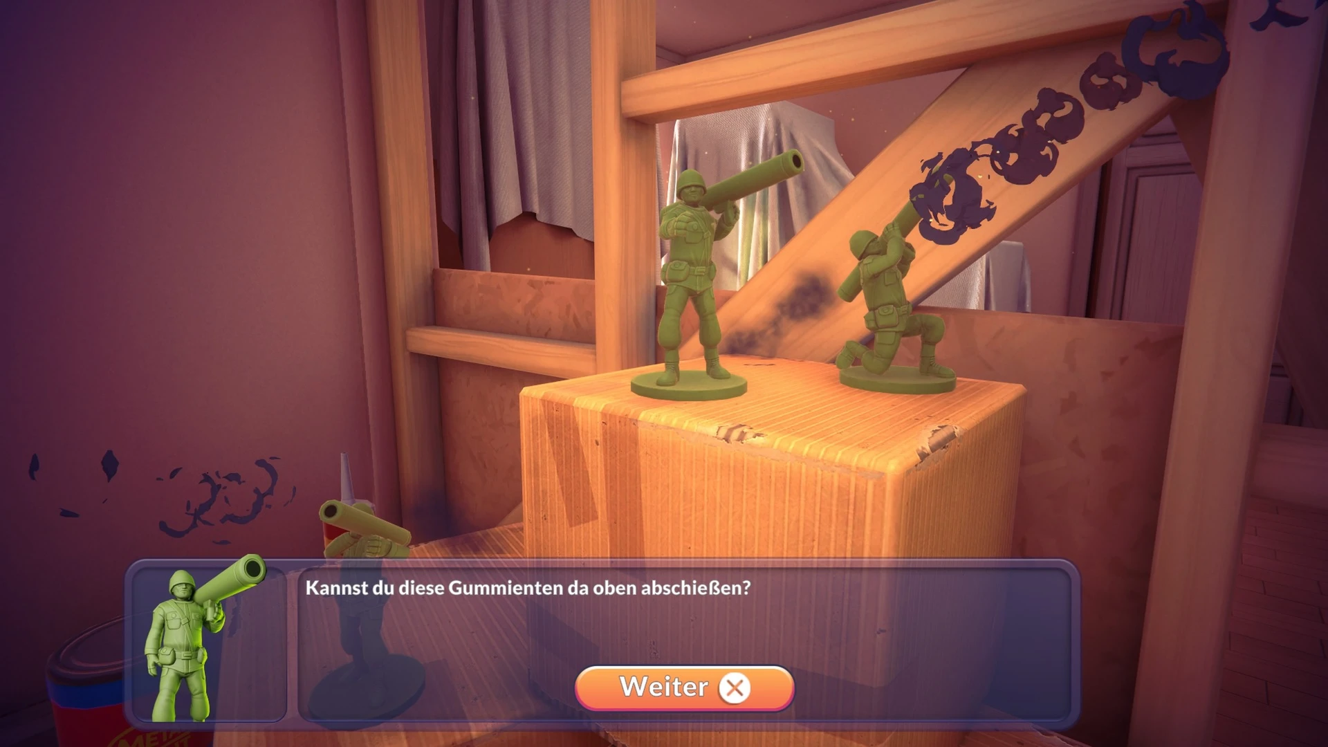Neben feindlichen Fliegern und Flakstellungen begegnen wir aber auch verbündeten Spielzeugen, denen wir unter die Arme greifen sollen. Da vermisst etwa ein schwer beschädigter Roboter seine Partnerin oder ein Dinosaurier seinen besten Freund. Ehrensache, dass wir tätig werden und die vermissten Personen aus den Klauen der Feinde entreißen möchten. Gemäß der eher spielerischen Ausrichtung sind die grundsätzliche Story und die Dialoge sehr seicht gehalten und orientieren sich eher an einer jüngeren Zielgruppe. Spitze Bemerkungen oder eine Portion Selbstironie wie beispielsweise in Eldrador Creatures Shadowfall sollte man hier also nicht erwarten. Das geht soweit in Ordnung, da die Handlung letztlich nur den Rahmen für die zahlreichen Missionen bietet.