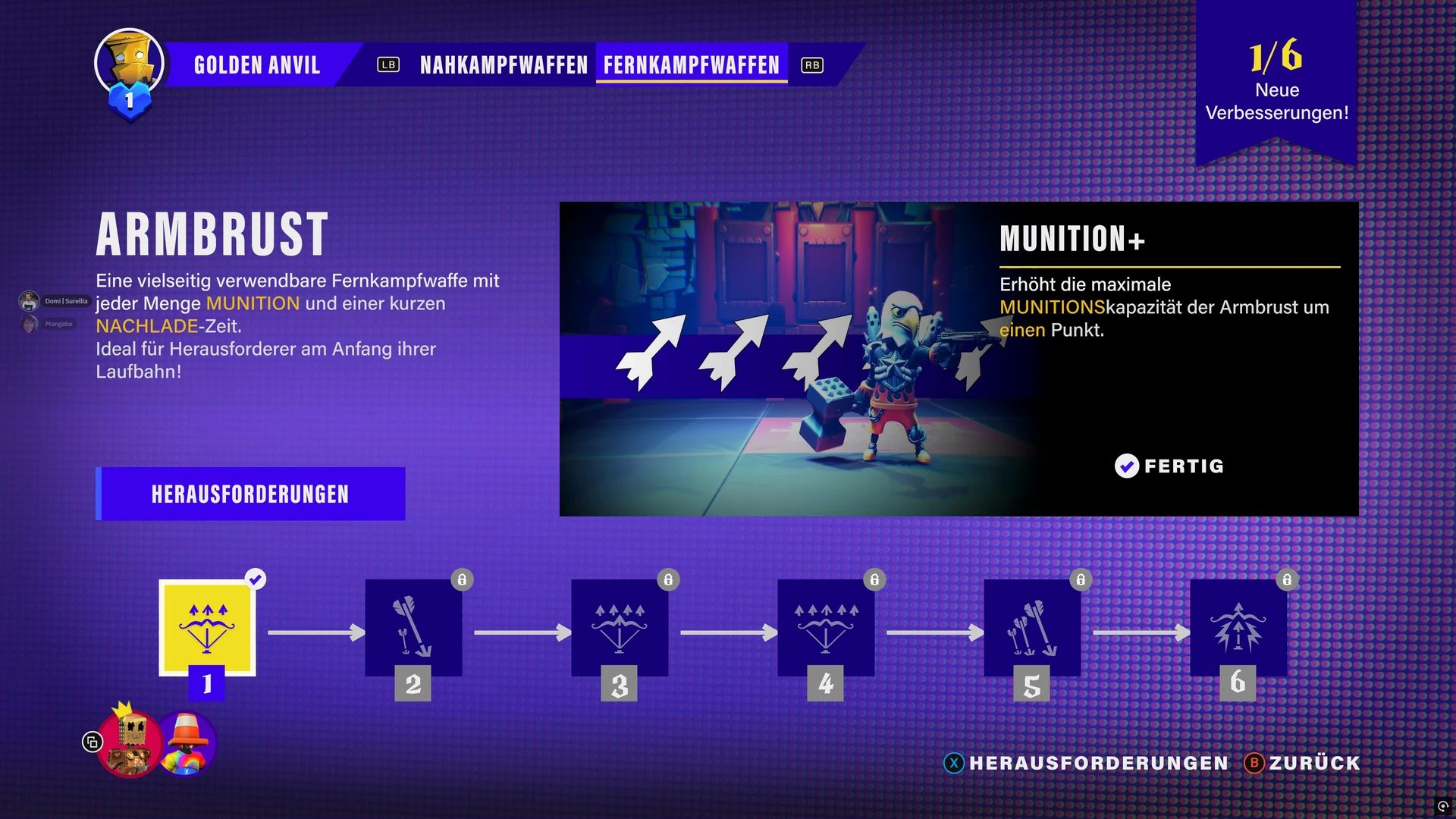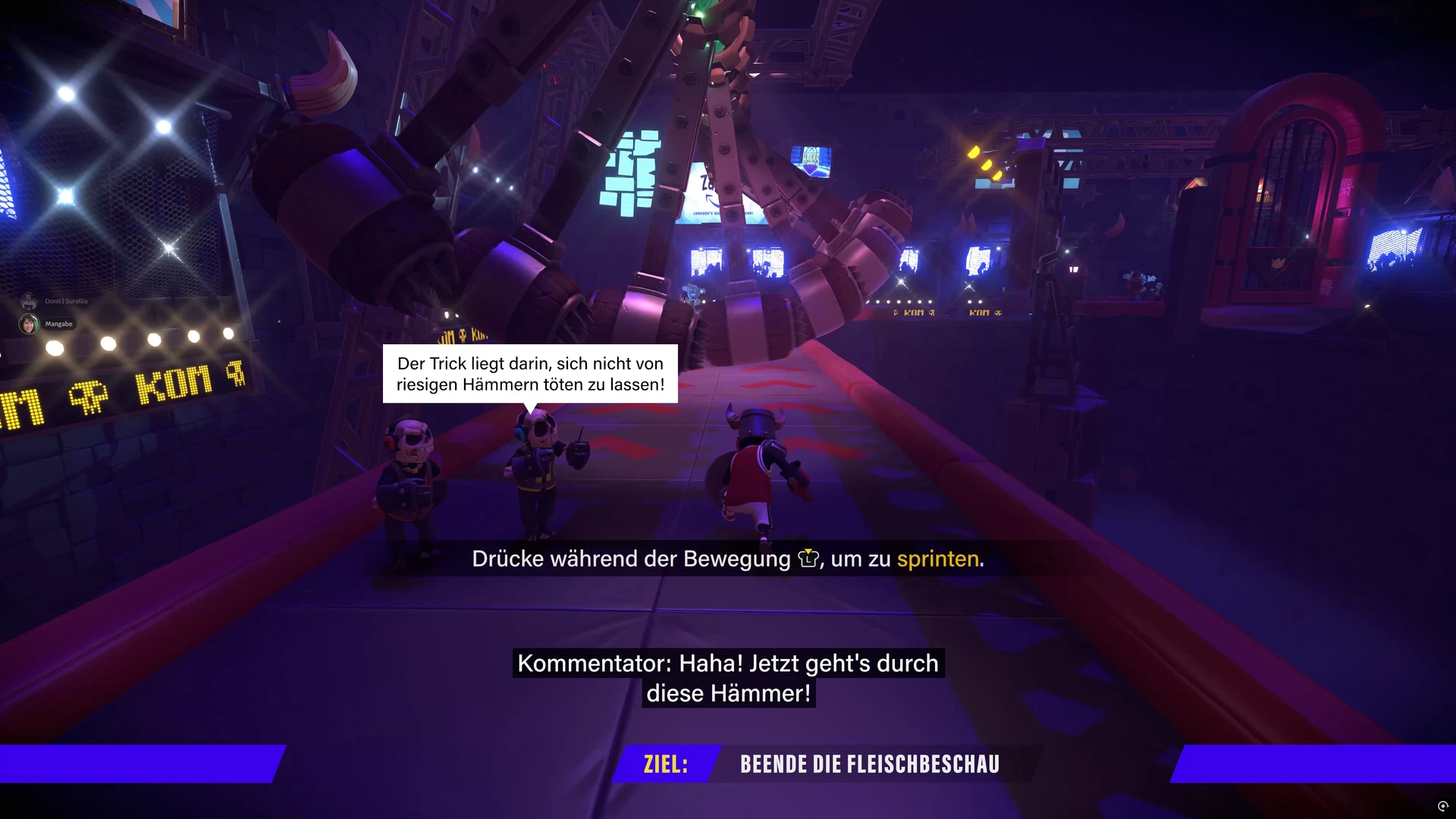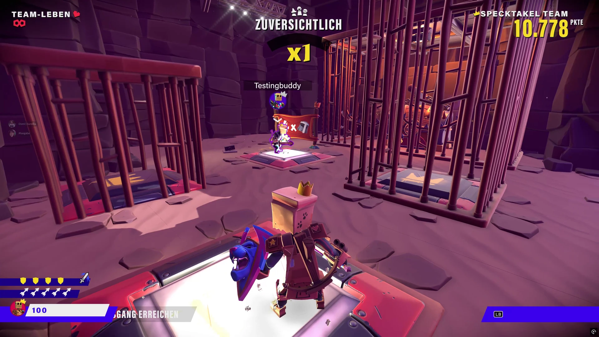 Wir haben das Spiel online zu zweit getestet, und das Zusammenspiel funktionierte reibungslos. Keine Lags, keine Verbindungsprobleme, selbst dann nicht, wenn Explosionen den halben Bildschirm füllen. Die Steuerung fühlt sich dabei angenehm direkt an, die Kämpfe sind simpel, aber befriedigend. Und wenn man seinen Mitspieler versehentlich mit einem Hammer aus dem Level haut, bleibt das ein Highlight, über das man noch Tage später lacht.
