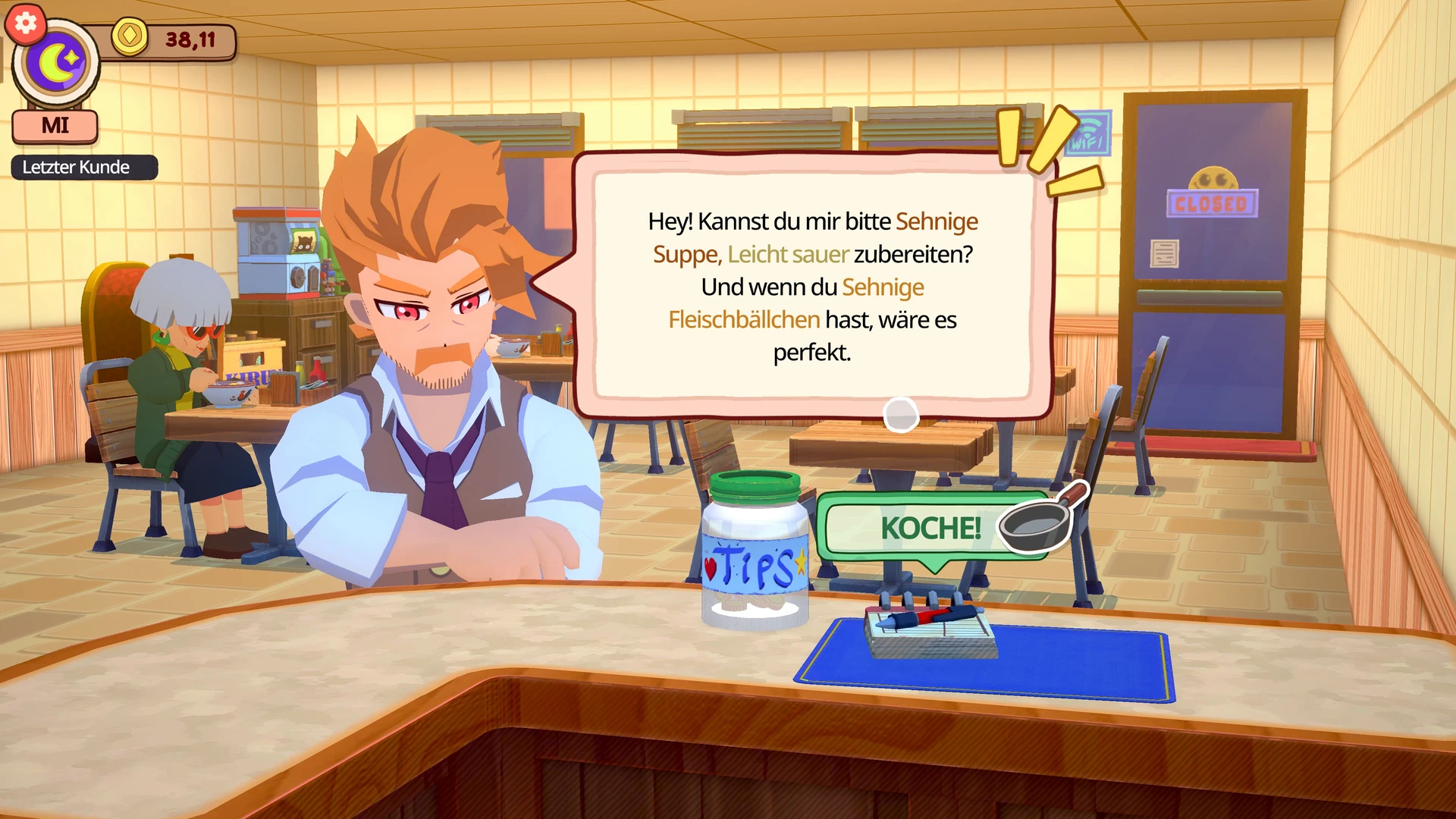 Und damit kommen wir zum eigentlichen Star des Spiels. Der Alltag in KuloNiku: Bowl Up! folgt einem festen Rhythmus: Laden aufschließen, Kunden bedienen, Feierabend. Was simpel klingt, entpuppt sich aber schnell als überraschend vielschichtiges System, das deutlich mehr Tiefe bietet, als der erste Eindruck vermuten lässt.
