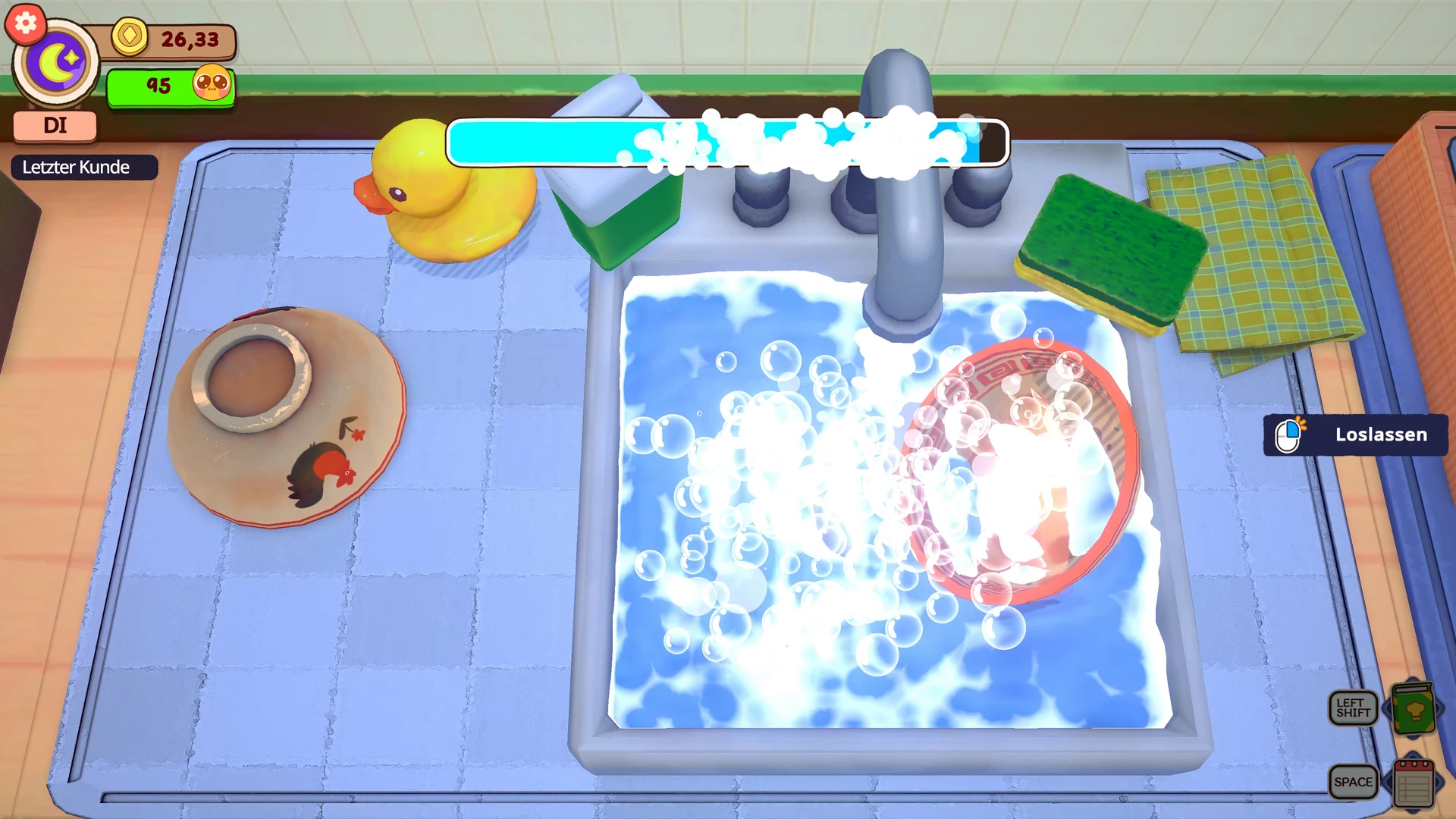 Jede Bestellung besteht aus mehreren Schritten. Im Kern dreht sich alles um euren Topf mit Brühe, in den ihr die verschiedensten Zutaten werft: Nudeln, Vermicelli, Fleischbällchen, sehnige Fleischbällchen und vieles mehr. Ist alles gar, wandert es auf den Teller, die Brühe kommt dazu. Nebenbei hackt ihr Knoblauch, Chili oder Pak Choi als Toppings. Und natürlich müssen die Teller danach auch gespült werden, sonst geht euch irgendwann das Geschirr aus. Das alles passiert über taktile Minigames aus der Ego-Perspektive, die sich tatsächlich befriedigend anfühlen. KuloNiku schafft es, den Kochprozess greifbar zu machen, ohne ihn unnötig zu verkomplizieren. Die Steuerung mit Maus und Tastatur funktioniert dabei einwandfrei. Jede Aktion fühlt sich direkt und responsiv an, was bei einem Spiel, das so stark auf seine Kochmechaniken setzt, absolut entscheidend ist.