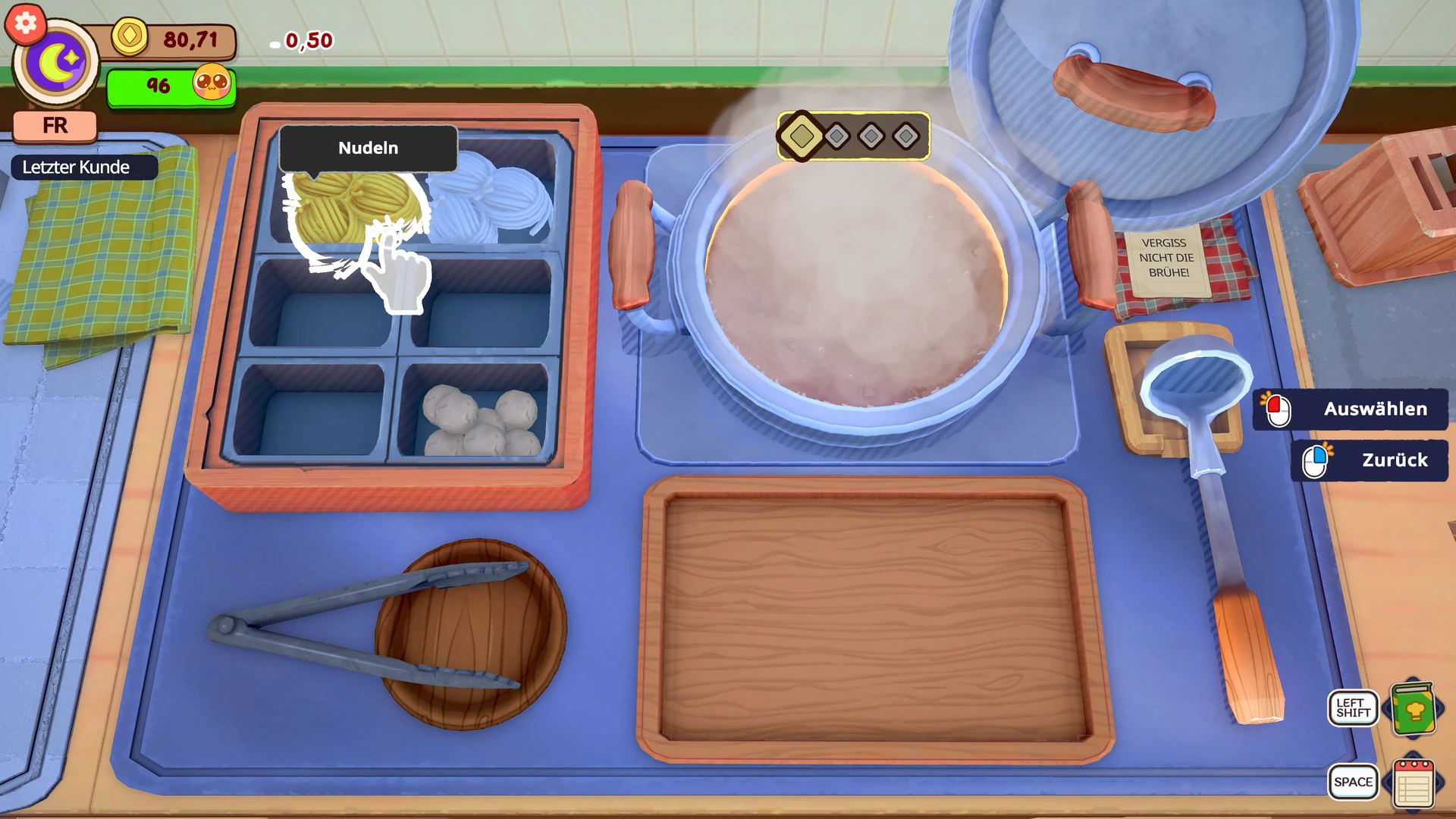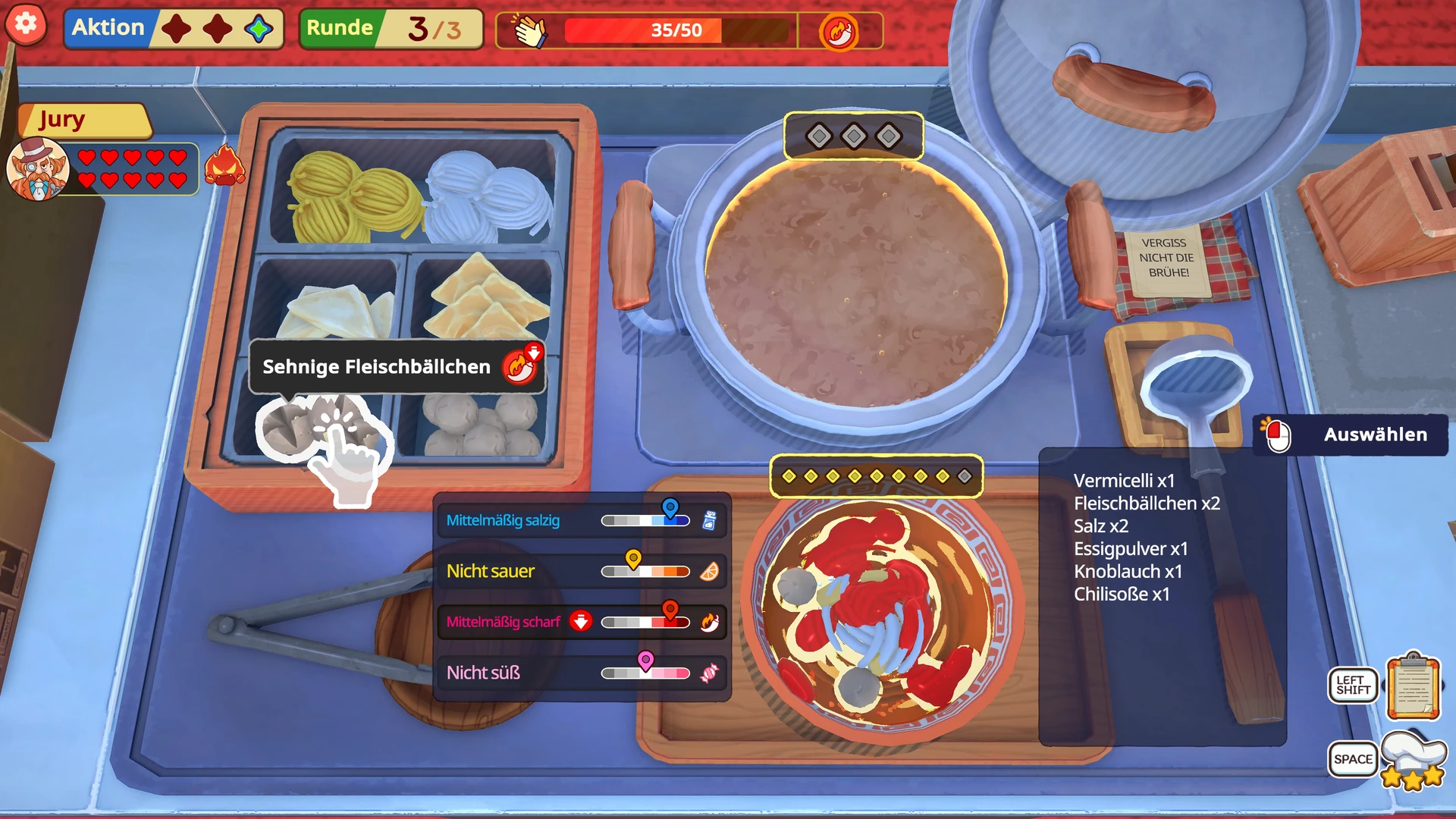 Besonders gelungen ist die Darstellung der Gerichte und Zutaten. Wenn ihr Fleischbällchen in die Brühe werft, Chili hackt oder die fertige Schüssel anrichtet, sieht das alles appetitlich aus. Für ein Indie-Spiel in dieser Preisklasse ist die visuelle Qualität bemerkenswert. Technisch lief bei uns alles ohne Probleme: keine Ruckler, keine Grafikfehler, keine Abstürze. Sauber.