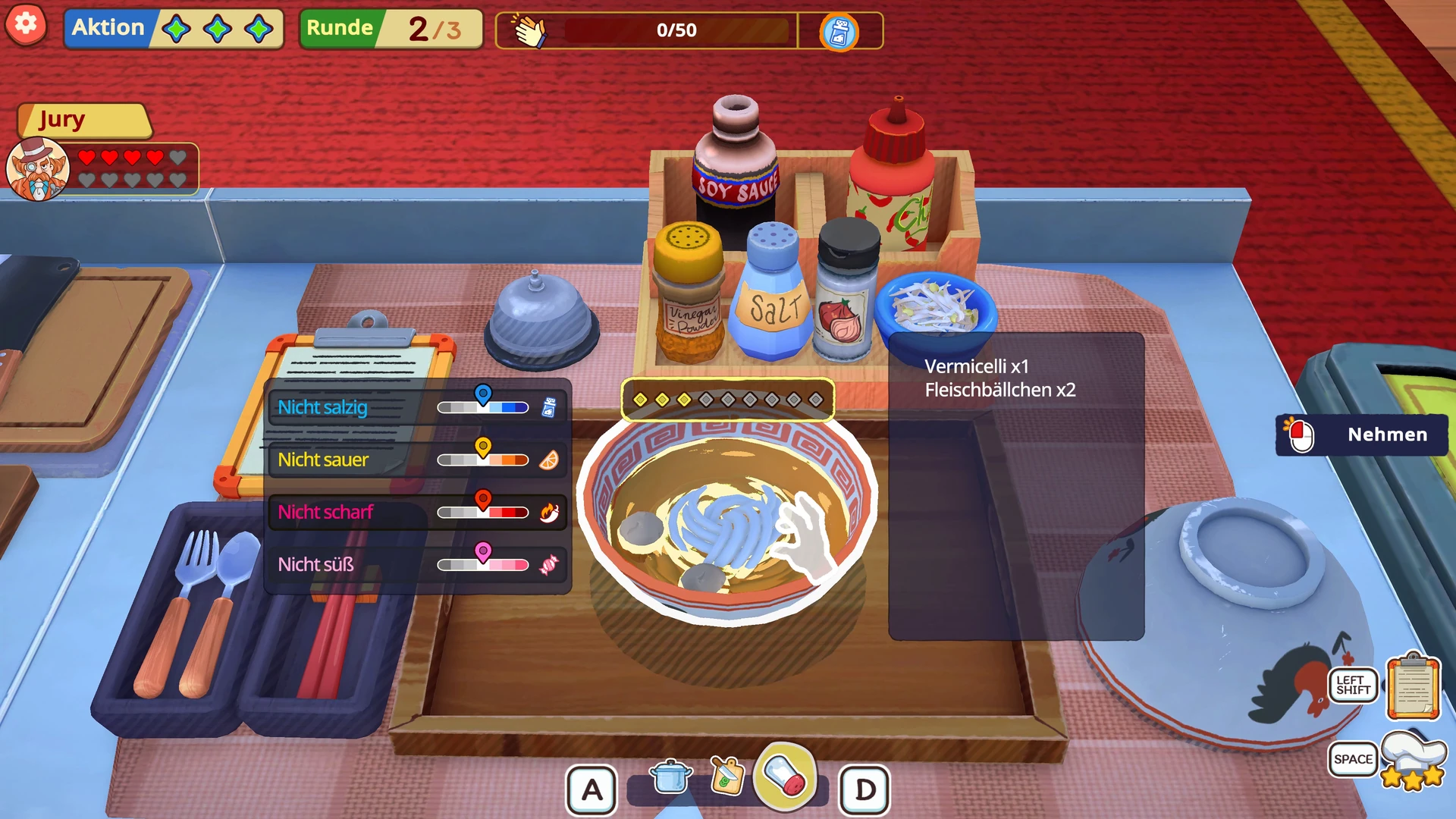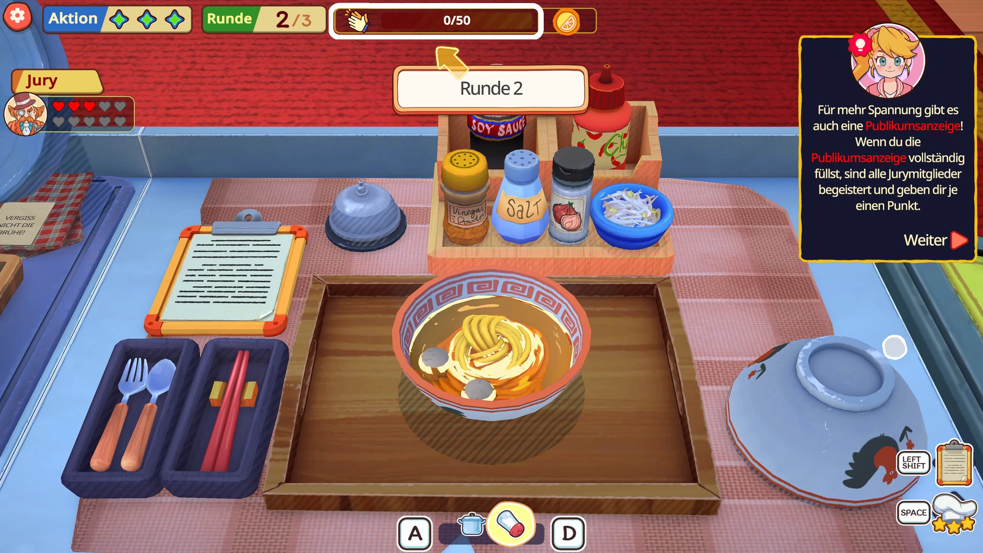 Das Prinzip unterscheidet sich dabei spürbar vom normalen Alltag. Statt Bestellungen am Fließband abzuarbeiten, wird es hier strategisch. Pro Runde stehen euch nur drei Aktionen zur Verfügung, die ihr clever einsetzen müsst. Die Juroren haben eigene Vorlieben und Abneigungen, die ihr idealerweise in eure Gerichte einbaut, um maximale Punkte abzustauben. Gleichzeitig gibt es Publikumswünsche, die einen gemeinsamen Begeisterungswert füllen. Schafft ihr es, diesen vor eurem Gegner vollzumachen, kassiert ihr einen Bonuspunkt. Aber Vorsicht: Beide Seiten füllen denselben Wert. Wer also zu sehr auf die Jury fokussiert und das Publikum ignoriert, überlässt den Bonus kampflos der Konkurrenz.