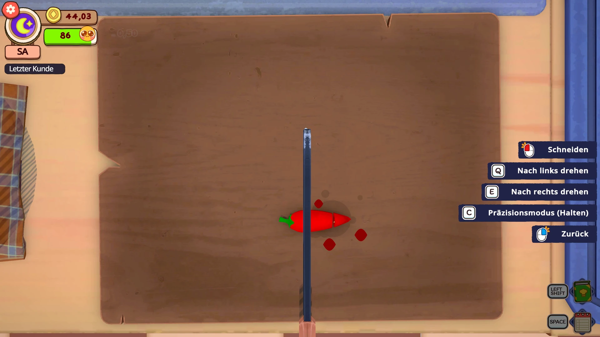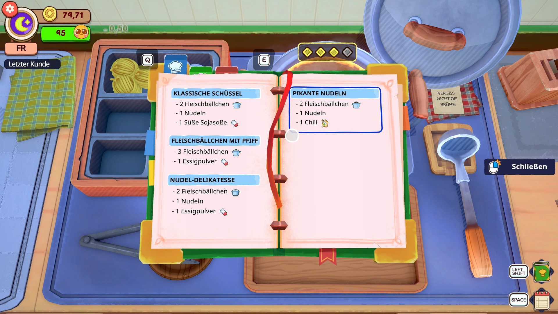 Richtig interessant wird es durch das Geschmackssystem. Jede Zutat beeinflusst das Geschmacksprofil eures Gerichts: Manche erhöhen den Salzgehalt, andere die Schärfe, Säure oder Süße. Einige Zutaten stärken das eine und senken gleichzeitig das andere. Ihr müsst also nicht einfach nur Zutaten in den Topf werfen, sondern darauf achten, dass das Endergebnis geschmacklich passt. Dazu kommen die Sonderwünsche der Gäste, die euch immer wieder aus der Routine holen. Mal will jemand extra scharf, mal bloß keine Säure, und manchmal kommt eine Bestellung rein, bei der ihr kurz innehalten müsst, weil die Kombination etwas Planung erfordert. Das sorgt dafür, dass selbst die zwanzigste Bestellung nicht auf Autopilot abgearbeitet wird.