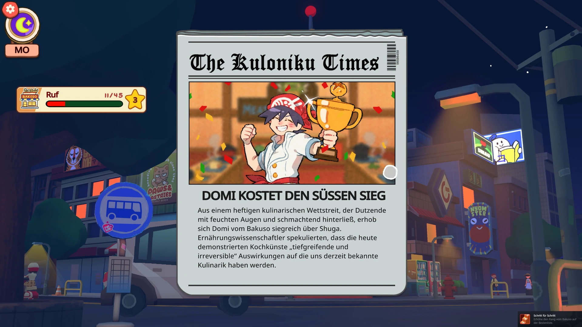 Die Prämisse von KuloNiku: Bowl Up! ist schnell erzählt: Eure Großmutter ist verstorben und hat euch ihr einst berühmtes Fleischklößchen-Restaurant „Bakuso" in der verschlafenen Kleinstadt KuloNiku hinterlassen. Klingt erstmal nach einem gemütlichen Neuanfang, wäre da nicht die Konkurrenz. Allen voran Souper Starz, das Promi-Restaurant der selbstverliebten Rockstarköchin Stella, die euch von Anfang an klarmacht, dass ihr hier nicht willkommen seid. Klassische Rivalin, klassische Motivation: Beweist, dass Omas Laden noch was drauf hat.