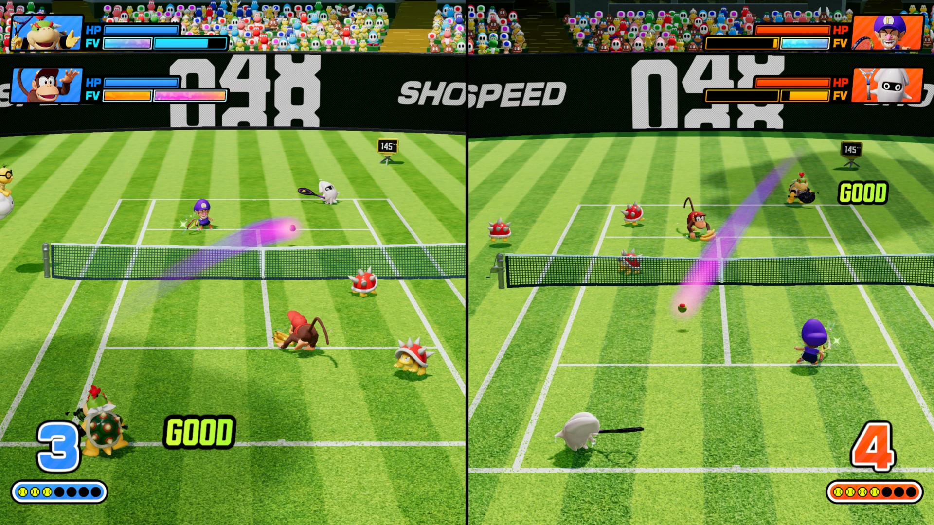 Gerade lokal entfaltet das Gameplay seine volle Stärke. Die schnellen Ballwechsel, überraschenden Fever-Effekte und das insgesamt hohe Tempo sorgen für genau die Art von Matches, bei denen auf dem Sofa plötzlich alle gleichzeitig aufspringen. Ein clever platzierter Slice oder ein unerwarteter Effekt eines Fever-Schlägers kann ein Match innerhalb weniger Sekunden drehen.