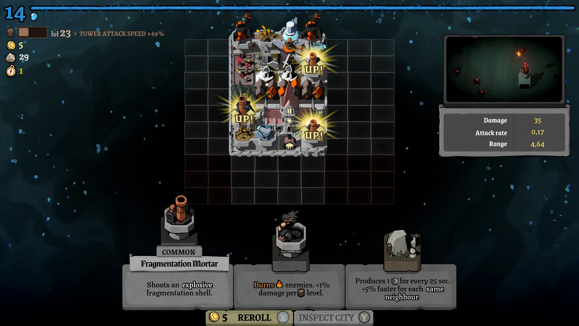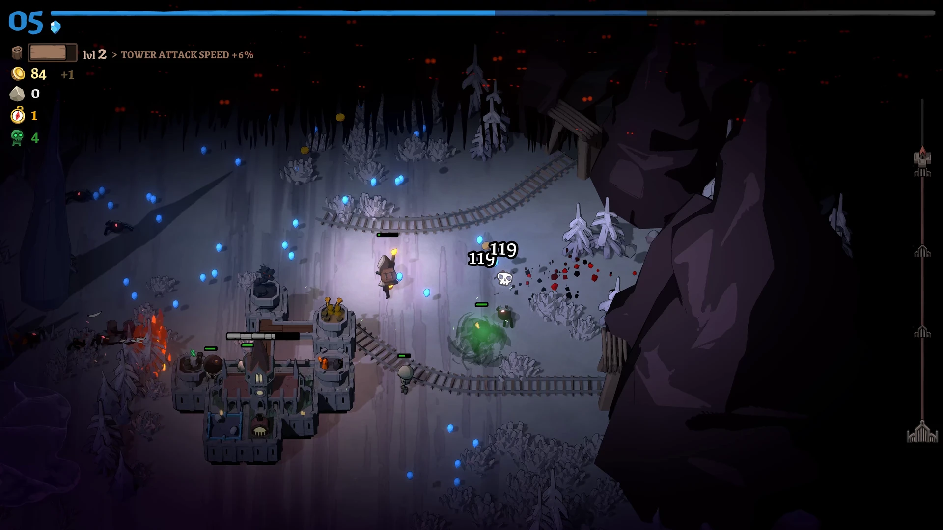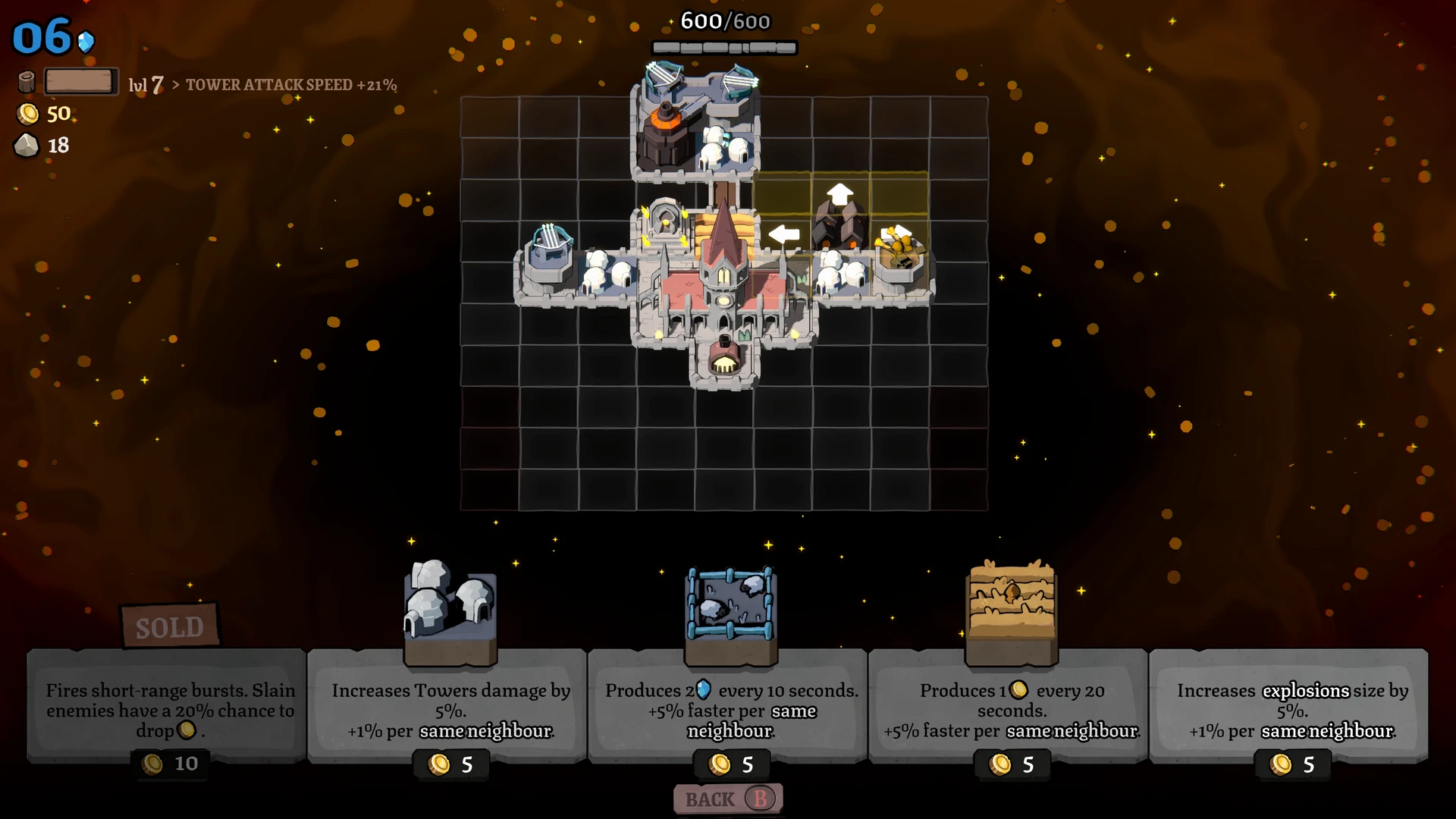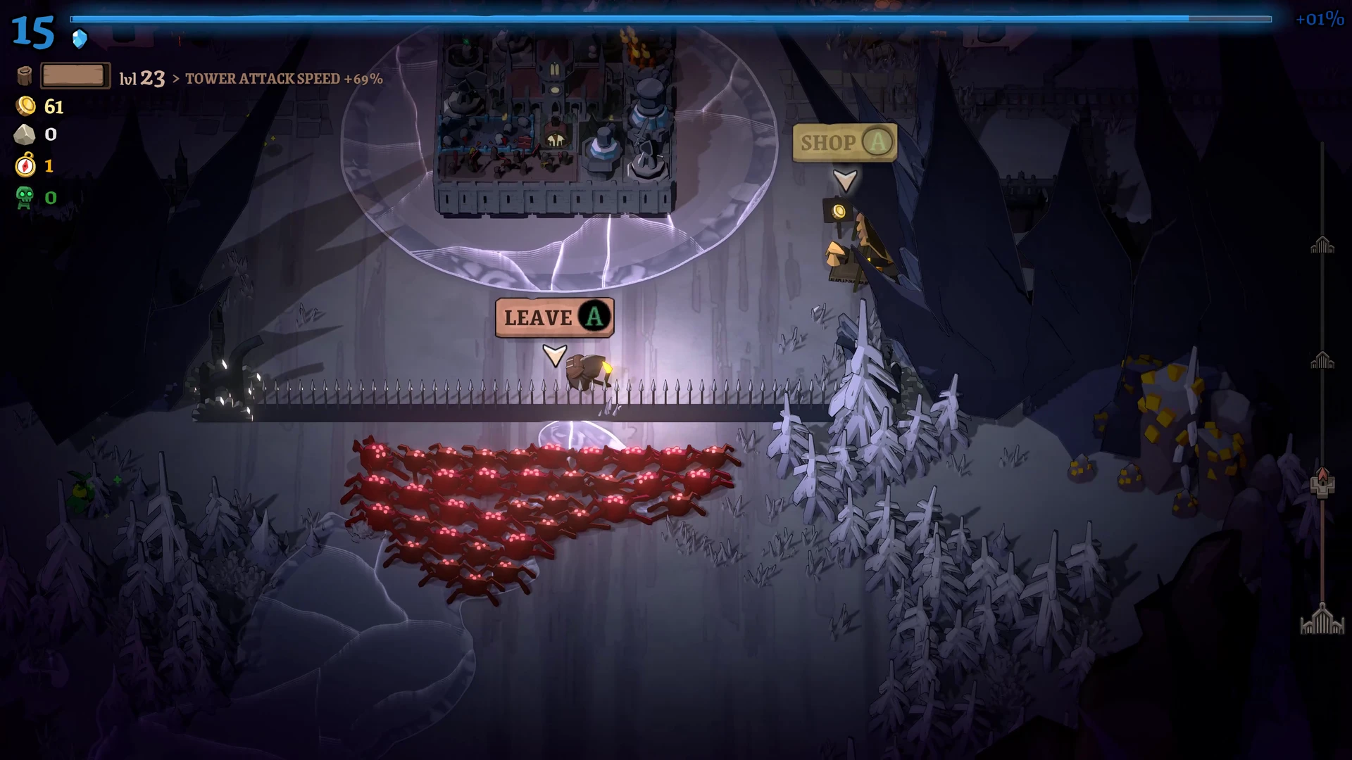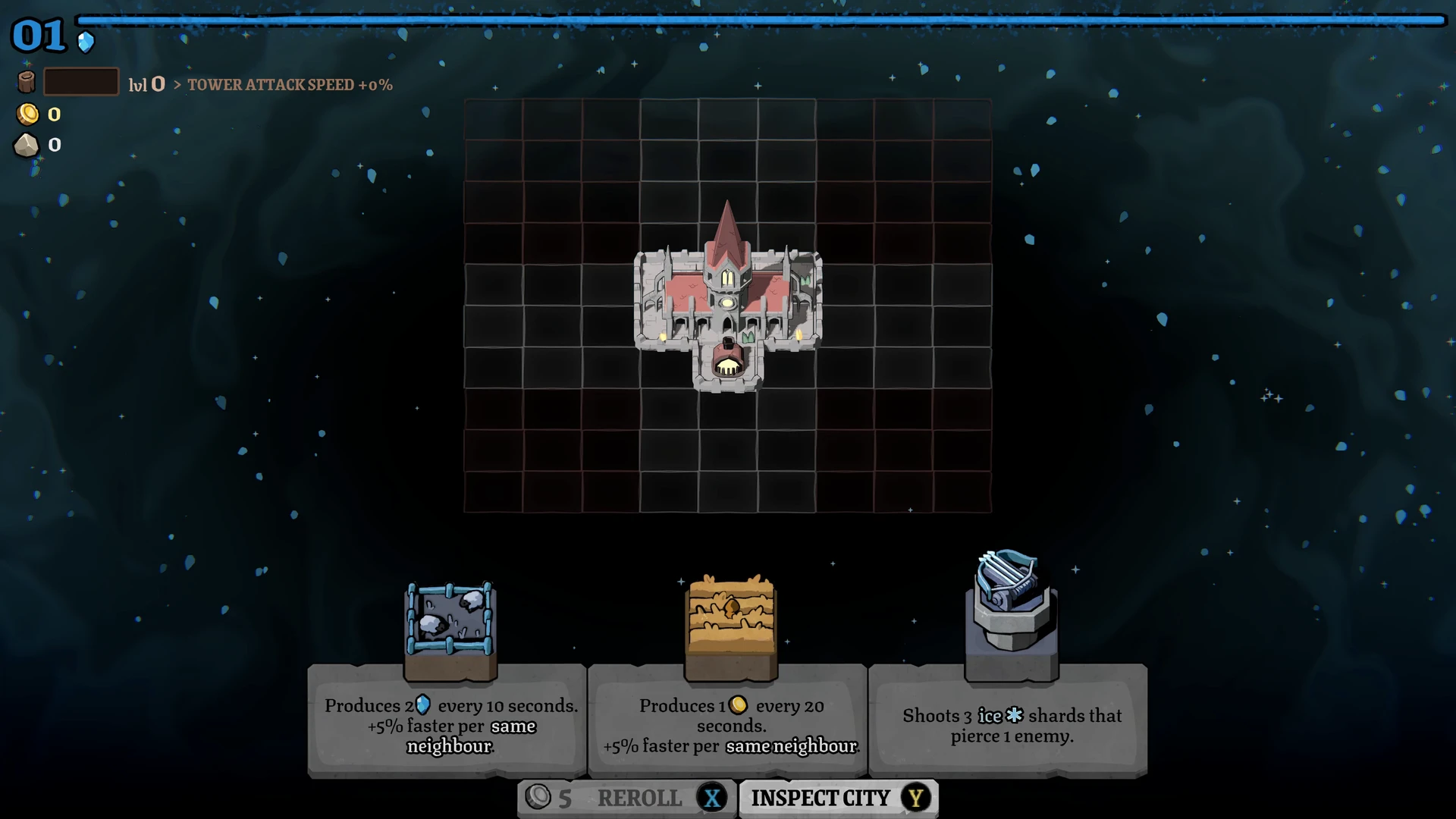 Rund um die Stadt liegt ein Raster, auf dem wir Türme, Produktionsgebäude und Versorgungsstrukturen errichten. Ein Wald erzeugt beispielsweise konstant Holz, während Türme die Feinde direkt unter Beschuss nehmen. Die Bauphase ist bewusst entschleunigt: Beim Öffnen des Baumodus pausiert das Spiel vollständig. Dies ermöglicht eine ruhige, durchdachte Planung, bevor die Stadt wieder Fahrt aufnimmt und die nächste Angriffswelle anschwillt.