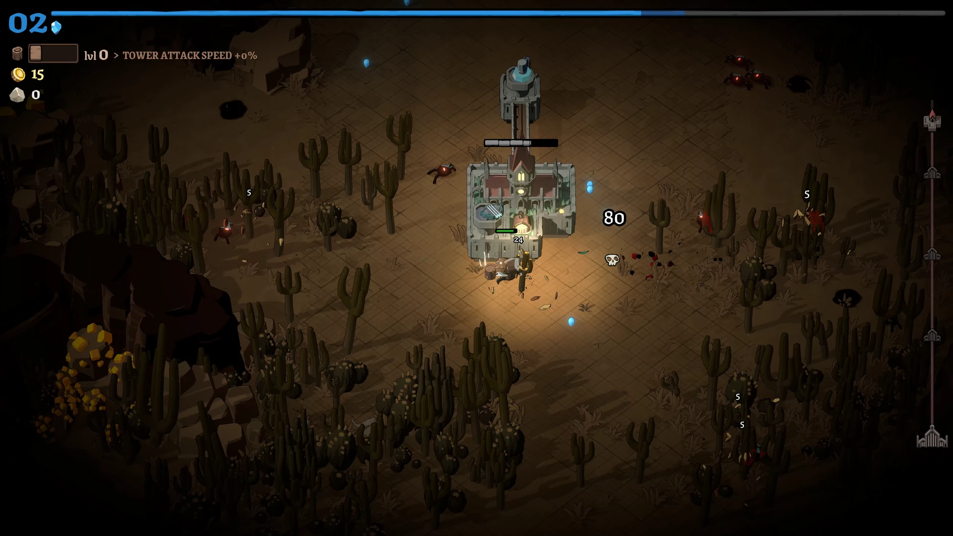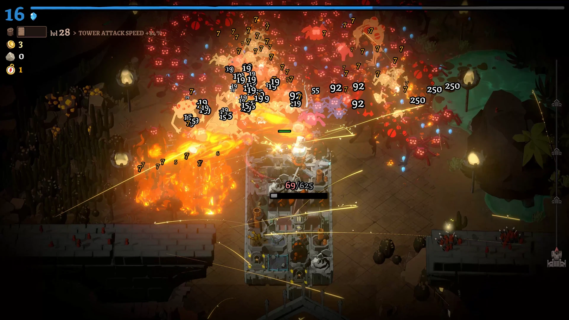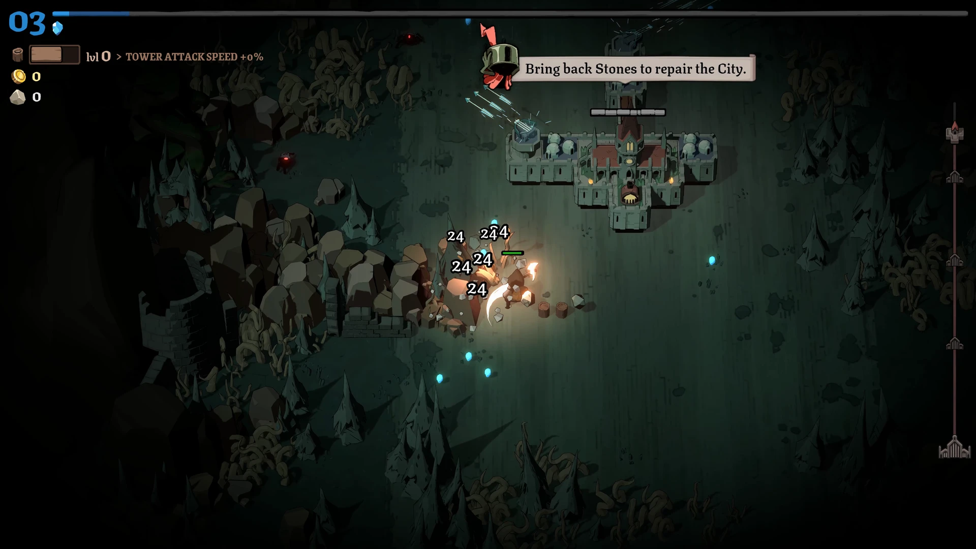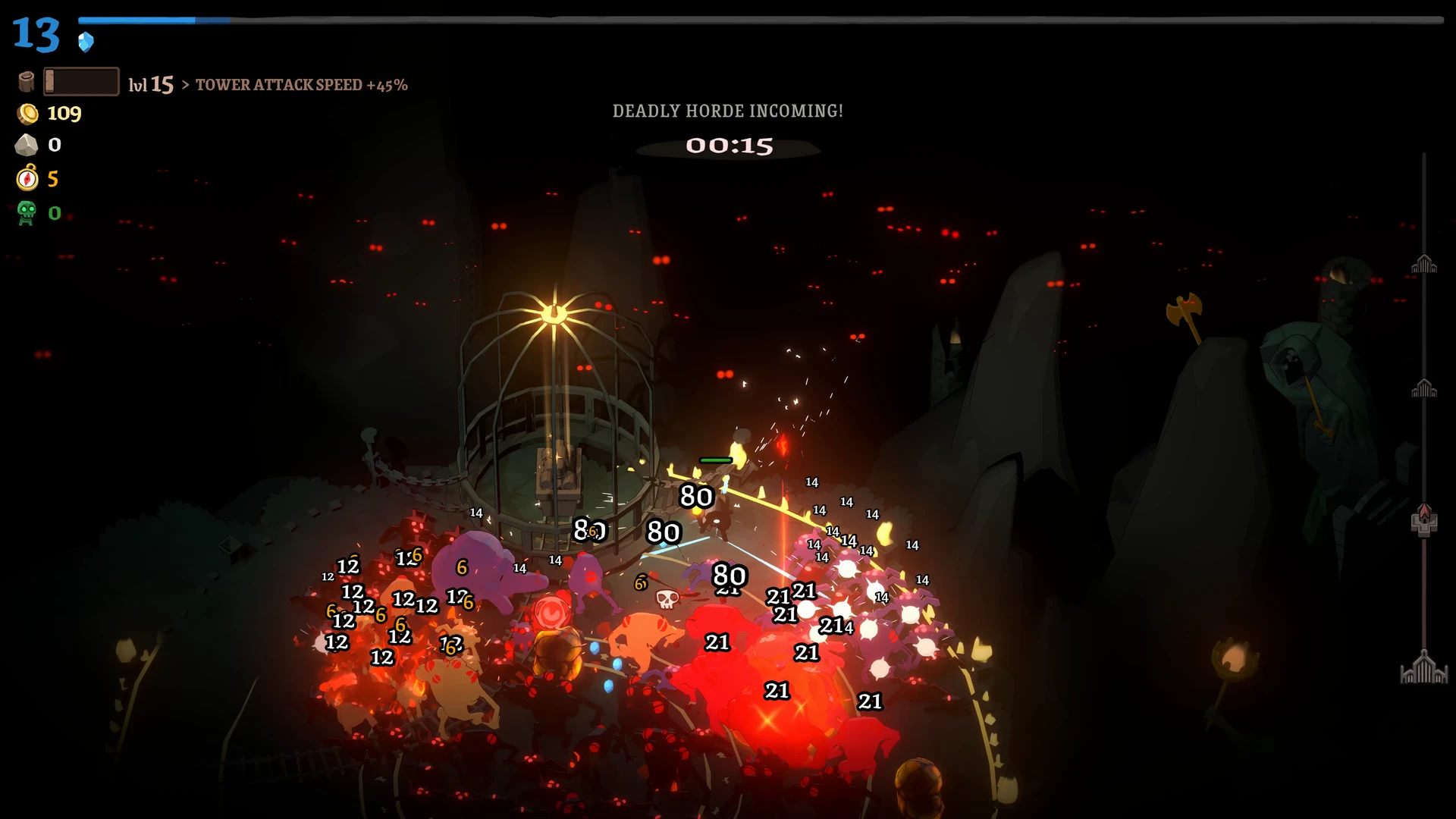 Rund um die Stadt liegt ein Raster, auf dem wir Türme, Produktionsgebäude und Versorgungsstrukturen errichten. Ein Wald erzeugt beispielsweise konstant Holz, während Türme die Feinde direkt unter Beschuss nehmen. Die Bauphase ist bewusst entschleunigt: Beim Öffnen des Baumodus pausiert das Spiel vollständig. Dies ermöglicht eine ruhige, durchdachte Planung, bevor die Stadt wieder Fahrt aufnimmt und die nächste Angriffswelle anschwillt.