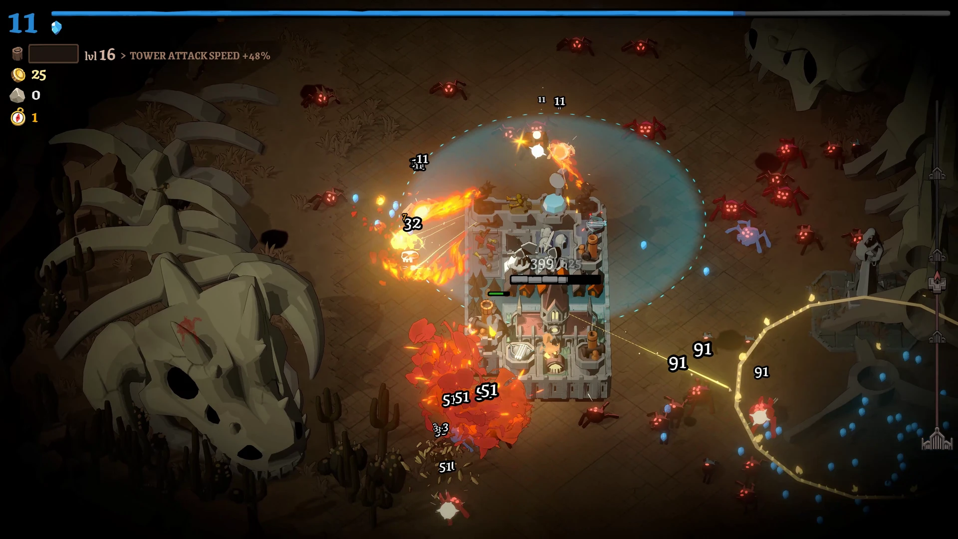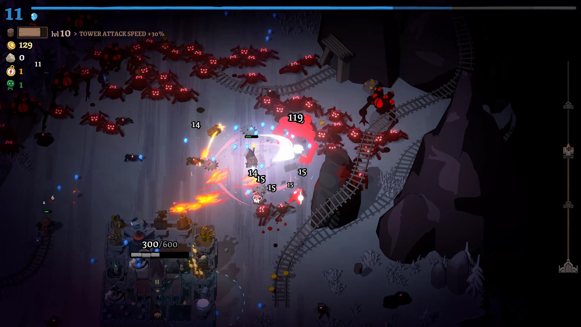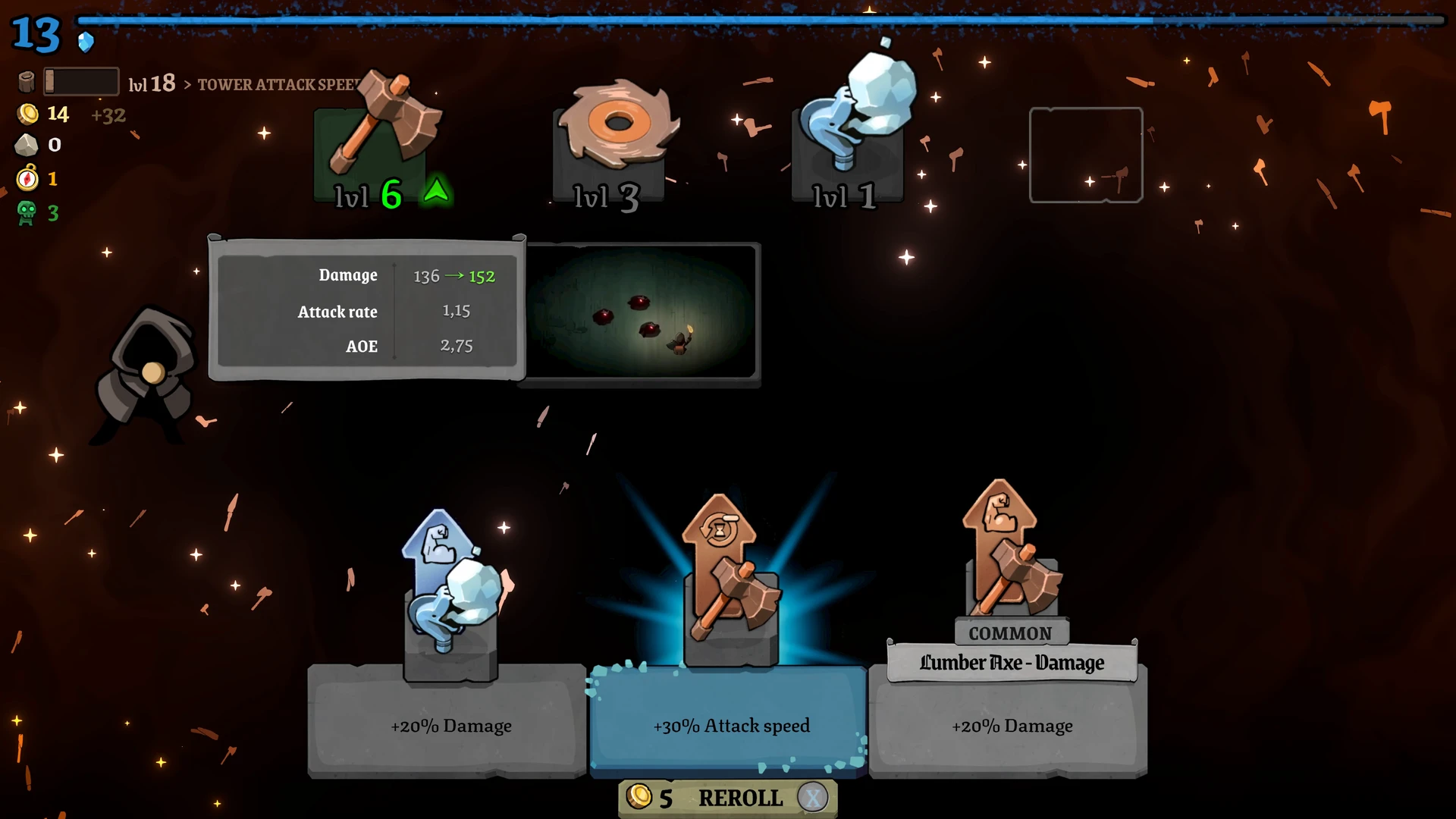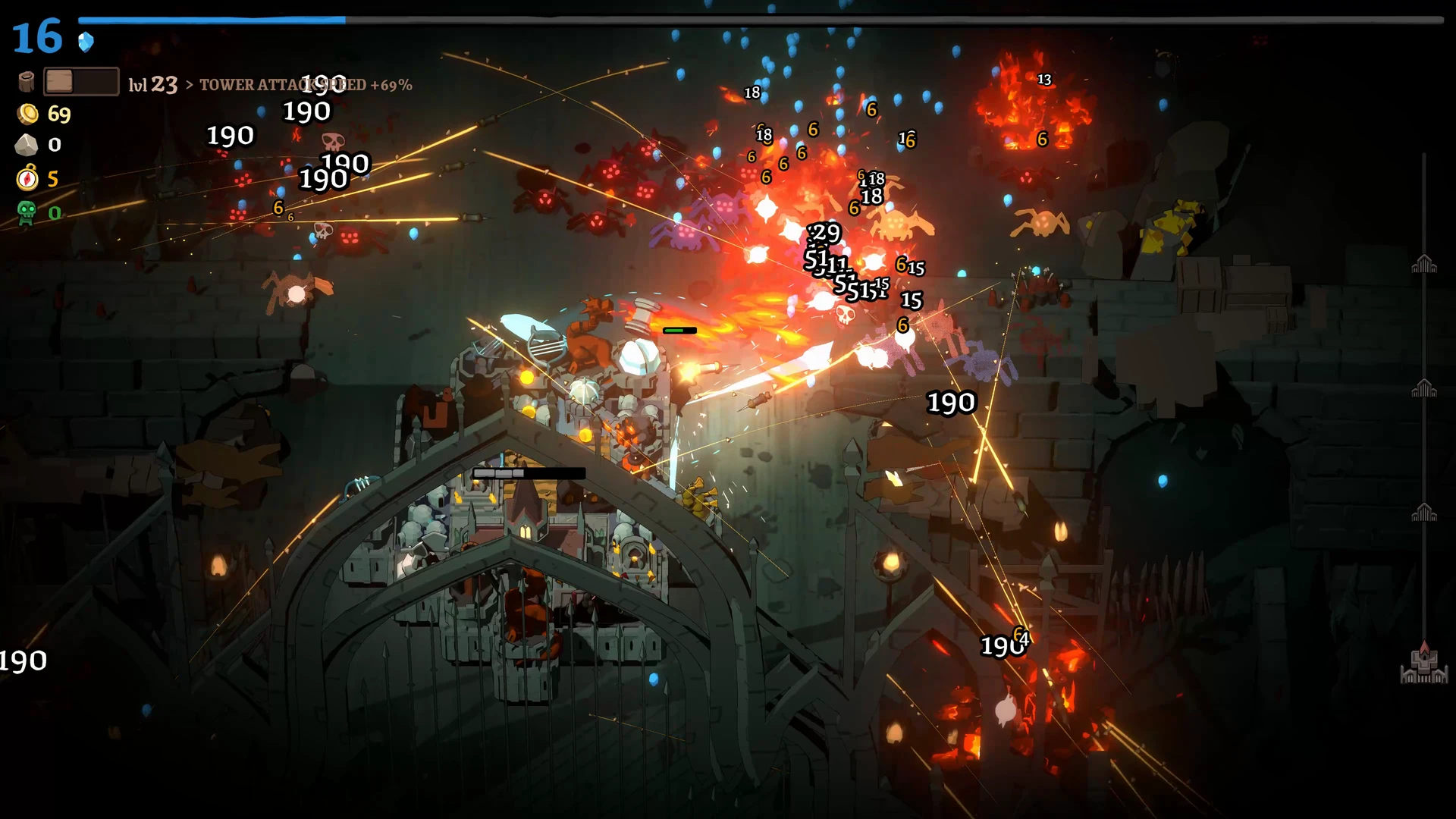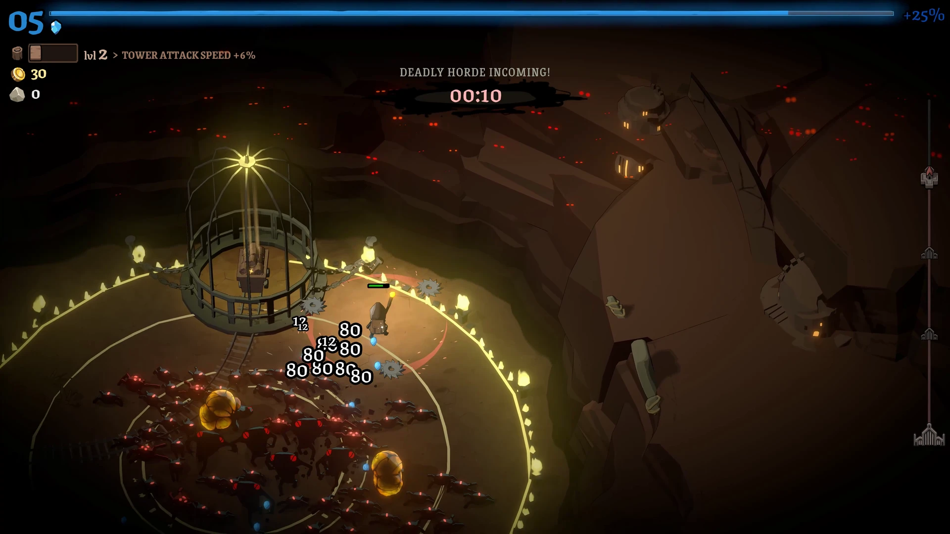 Rund um die Stadt liegt ein Raster, auf dem wir Türme, Produktionsgebäude und Versorgungsstrukturen errichten. Ein Wald erzeugt beispielsweise konstant Holz, während Türme die Feinde direkt unter Beschuss nehmen. Die Bauphase ist bewusst entschleunigt: Beim Öffnen des Baumodus pausiert das Spiel vollständig. Dies ermöglicht eine ruhige, durchdachte Planung, bevor die Stadt wieder Fahrt aufnimmt und die nächste Angriffswelle anschwillt.