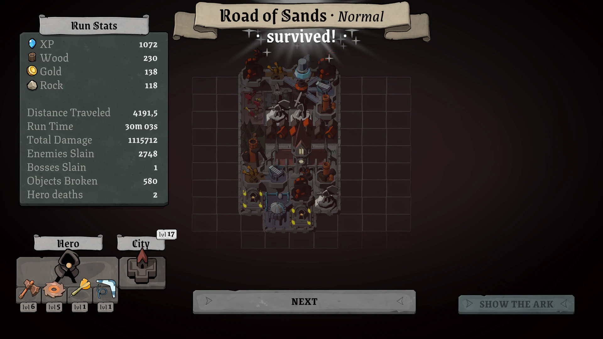 Stirbt unser Held, ist der Run nicht vorbei, sondern markiert einen Übergang. Ein Grab wird errichtet, und eine neue Figur übernimmt nahtlos die Verantwortung. Diese Mechanik erzeugt keinen erzählerischen Bruch, sondern verleiht dem Spiel eine nüchterne, aber klare Struktur: Scheitern gehört zum Fortschritt. Vorallem sind wir nur ein Mittel zum Zweck, da die Stadt um jeden Preis überleben muss bis wir im sicheren Hafen angekommen sind. Dafür müssen auch mal ein paar Helden das Zeitliche segnen.