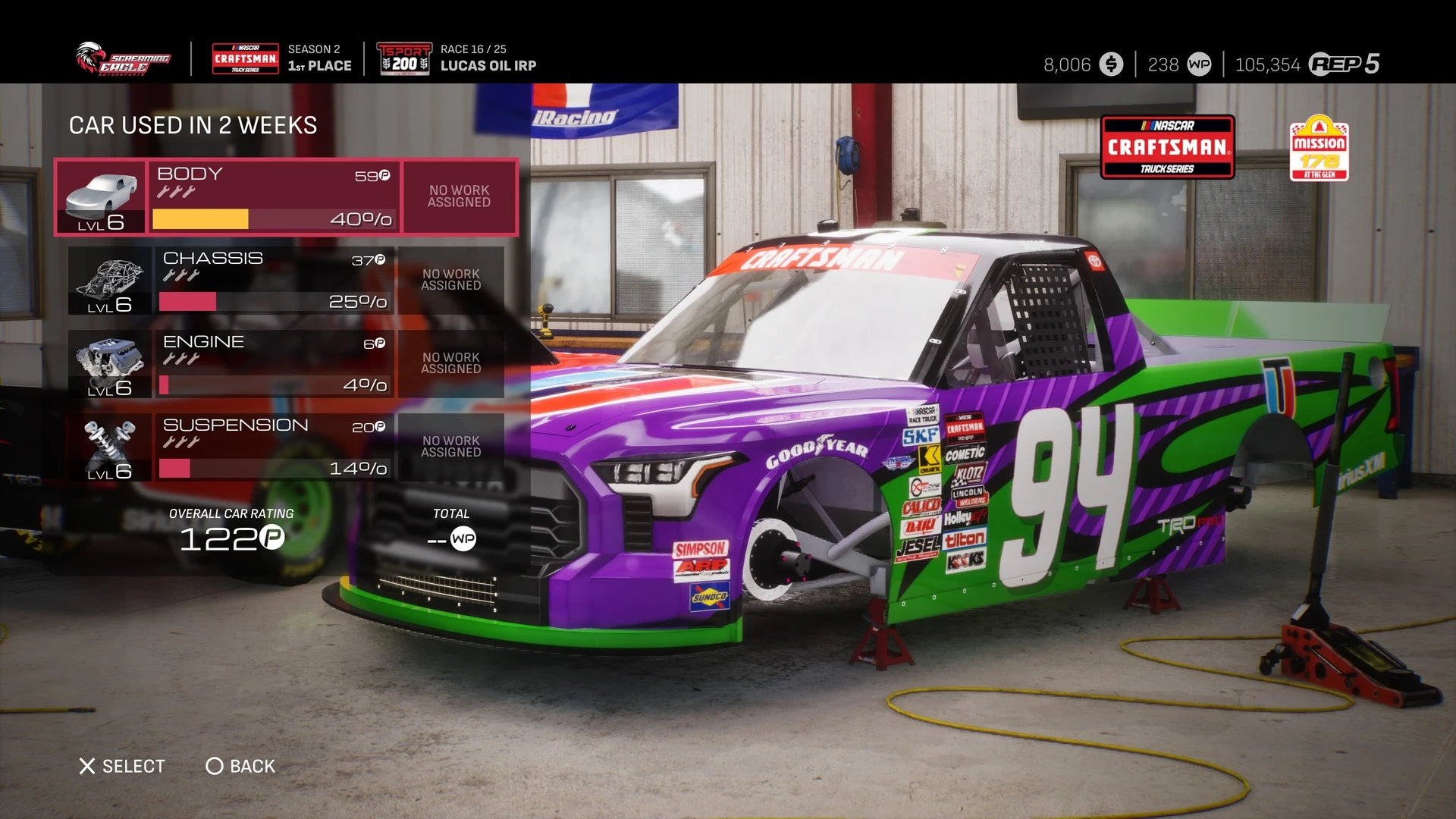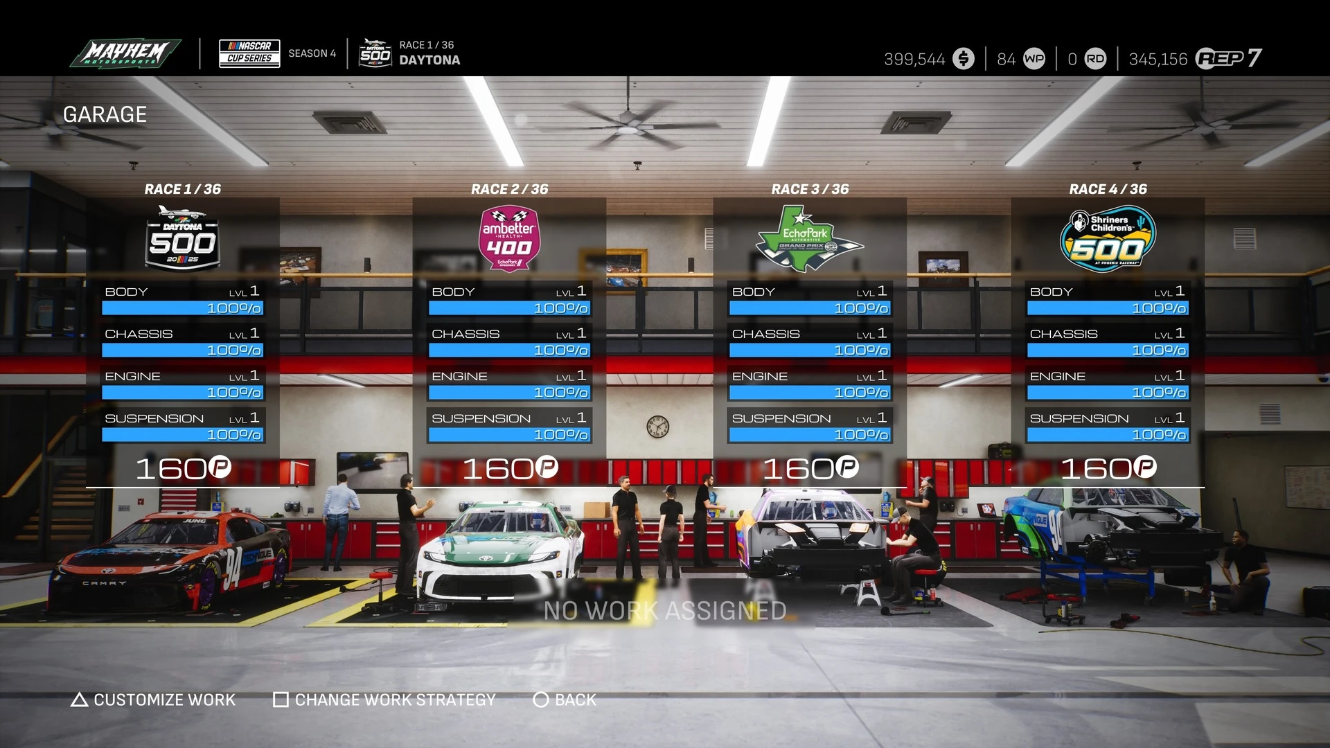 NASCAR 25 führt uns in der ARCA Menards Series behutsam in das letztlich rudimentäre Management-System ein, fügt aber mit jedem Klassenaufstieg neue Elemente hinzu. Denn direkt bei der Craftsman Truck Series stehen uns schon zwei Wagen zur Verfügung, die wir managen müssen. Das System dahinter ist relativ einfach, denn die Boliden bestreiten immer abwechselnd die Rennwochenenden. Während wir in der Xfinity Series dann drei Autos in der Garage haben, erlebt das System mit der NASCAR Cup Series seinen Höhepunkt und wir managen ganze vier Rennwagen gleichzeitig.