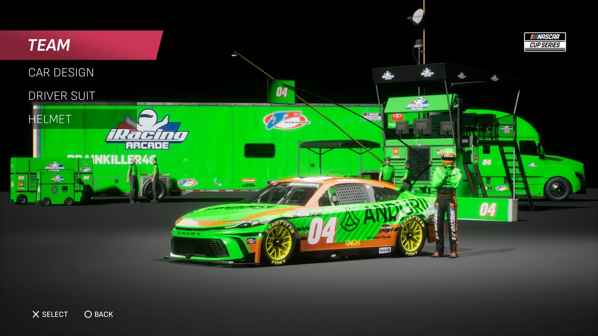 Dies bringt einige Vorteile mit sich. So dürfen wir Fahrzeug, Helm, Rennanzug sowie Teamtruck in einem umfangreichen Editor selbst lackieren und damit unsere eigene Teamidentität herausarbeiten. Die Optionen im Editor sind absolut gelungen und bieten viele vorgefertigte und stimmungsvolle Designs, deren Farbverteilung wir individuell anpassen dürfen. Selbiges gilt für Aufkleber, Muster und wichtige Sponsoren-Decals wie etwa das des Herstellers. Und natürlich mag der Hauptsponsor prominent auf unserem Fahrzeug vertreten sein. Komplett frei ist dabei die Wahl des Herstellers Ford, Toyota oder Chevrolet.