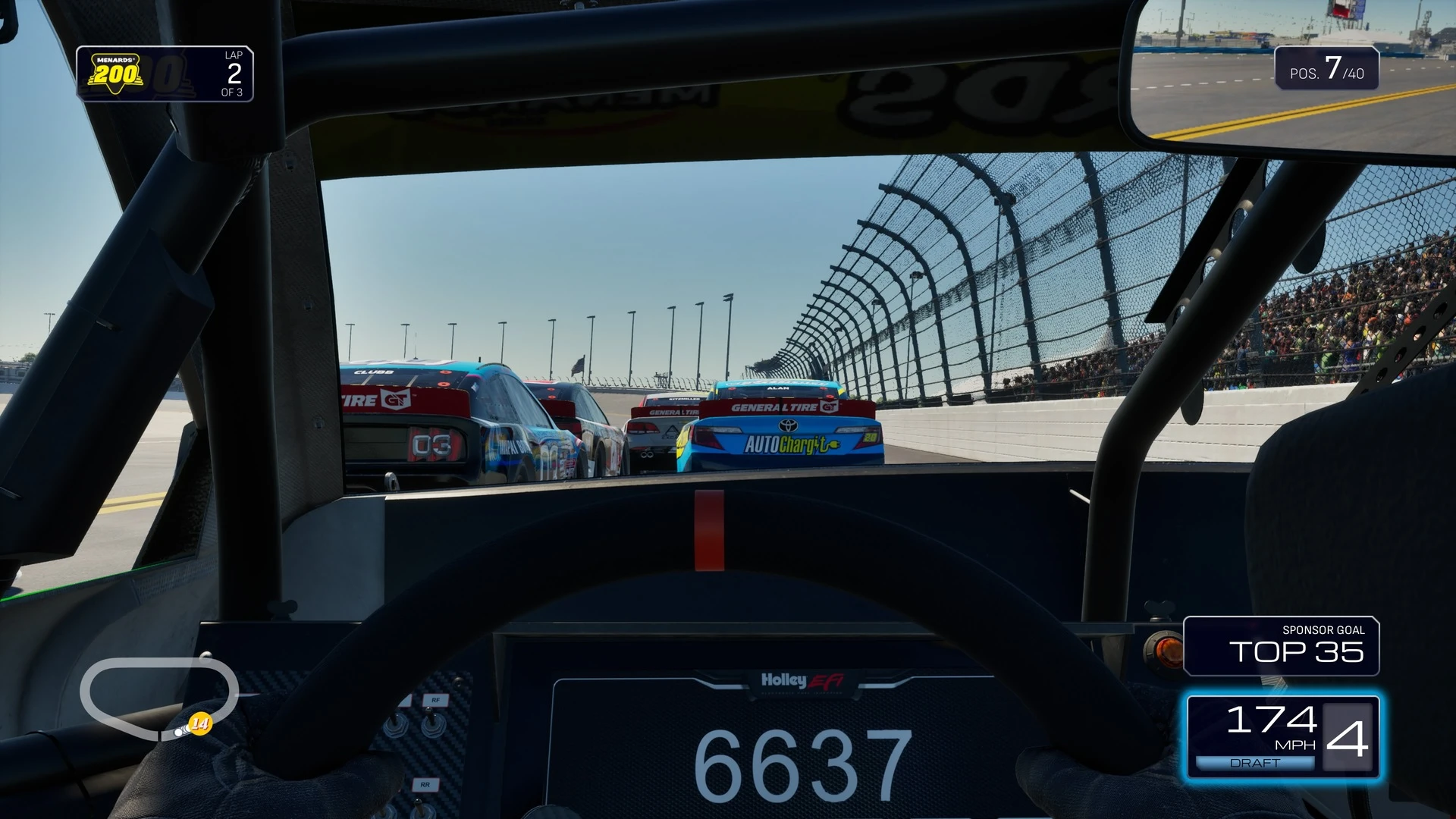 Für sich alleine wäre dies keine allzu große Herausforderung, doch sind wir in NASCAR 25 mit insgesamt 37 anderen Fahrzeugen gleichzeitig auf der Piste. Gerade die Fahrt im Pulk unter Nutzung des gegnerischen Windschattens sowie so ziemlich jedem Millimeter Piste sorgt für schöne Adrenalinstöße und richtig unterhaltsame Rennen. Im Rennbetrieb spüren wir zudem jede Bodenwelle und haben bei über 180 Meilen pro Stunde in den Steilkurven durchaus alle Hände voll zu tun, den Wagen gerade in der Spur zu halten.