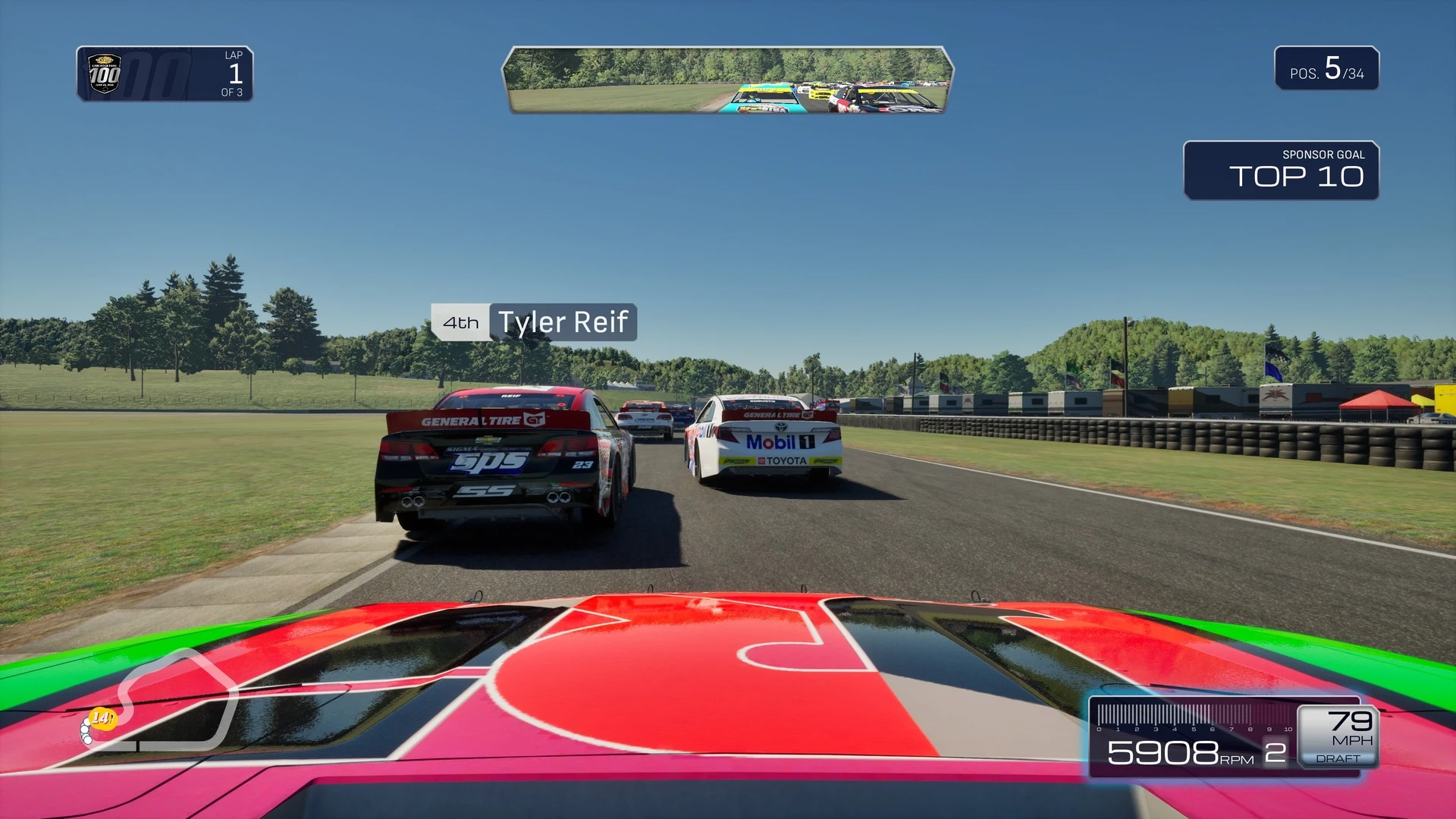 Doch genug der grauen Theorie in irgendwelchen staubigen Hinterhofgaragen. Zeit, die Motoren zu starten! Auch hier kann NASCAR 25 zunächst wieder überzeugen und liefert zu jeder Rennsession schöne Kamerafahrten über unseren Wagen, natürlich nicht ohne einen obligatorischen Zoom auf die amerikanische Flagge sowie den typischen Überflug einiger Kampfjets. Leider gibt es pro Klasse nur eine einzige Sequenz, sodass sich dieses coole Feature mit zunehmender Spieldauer stark abnutzt.