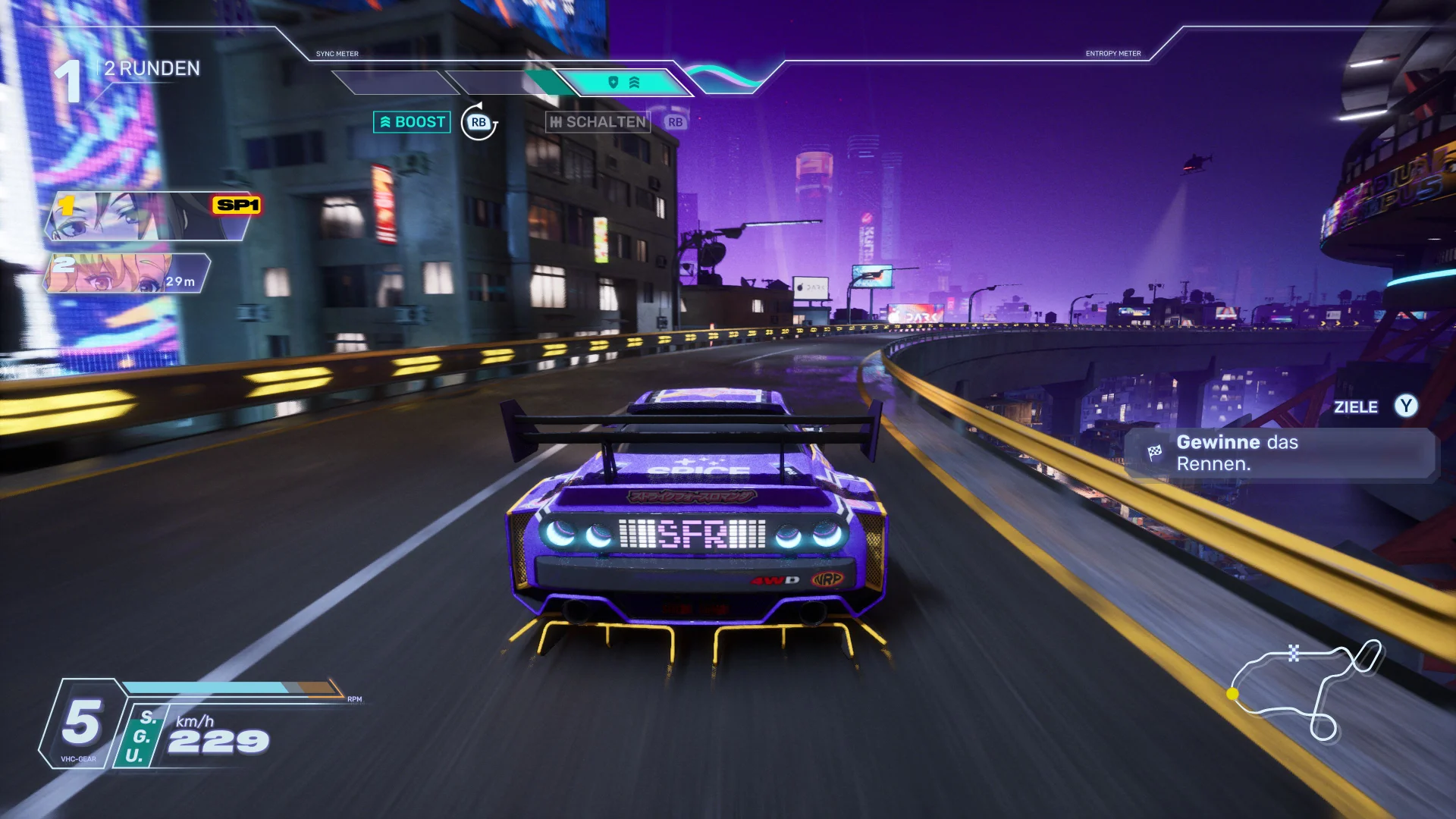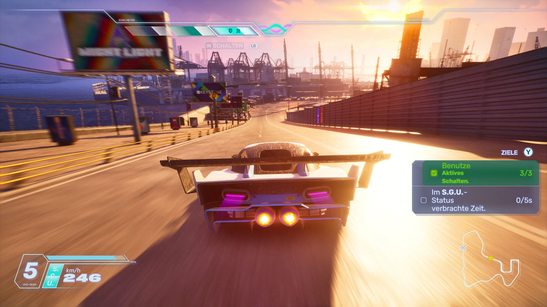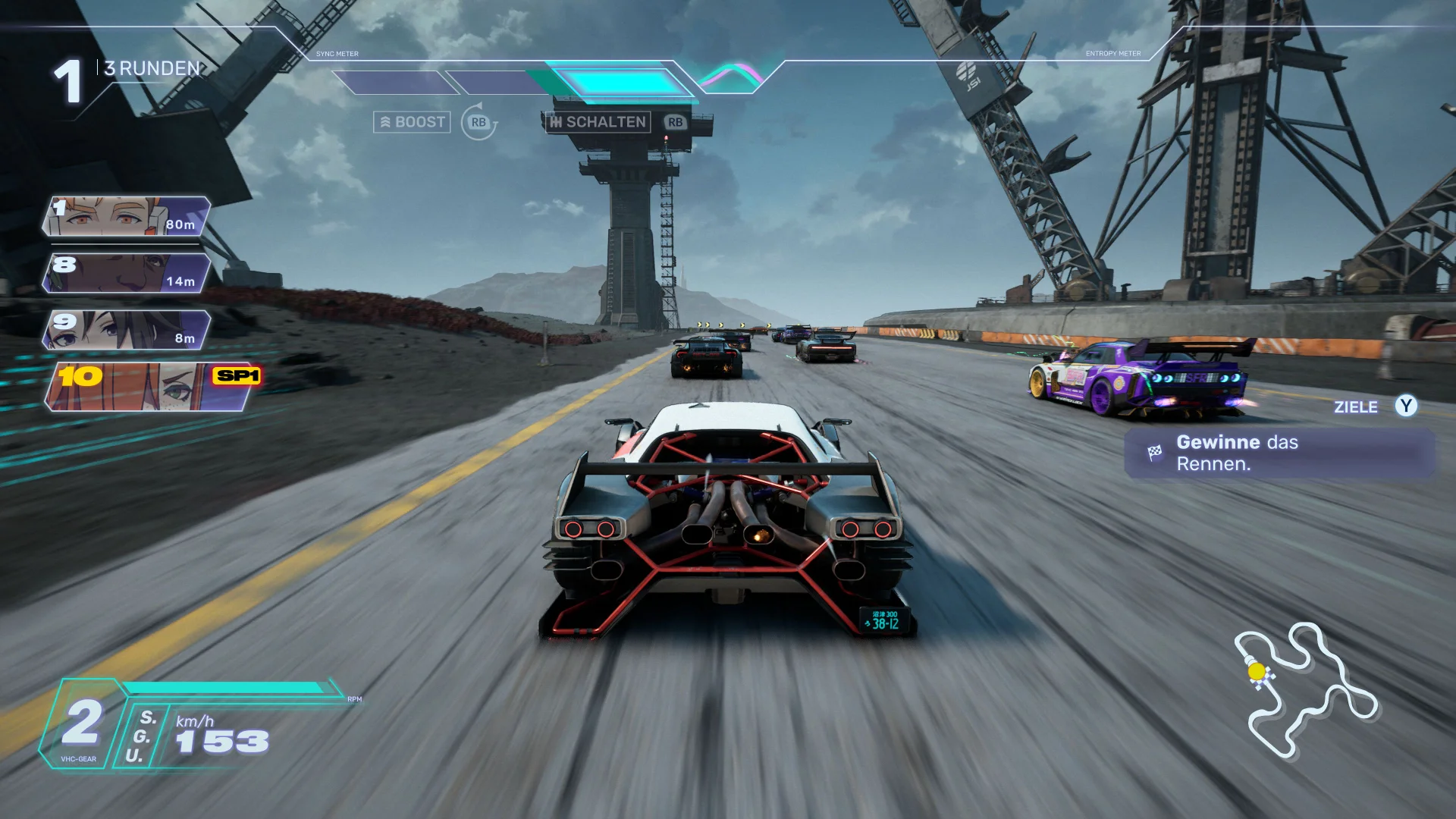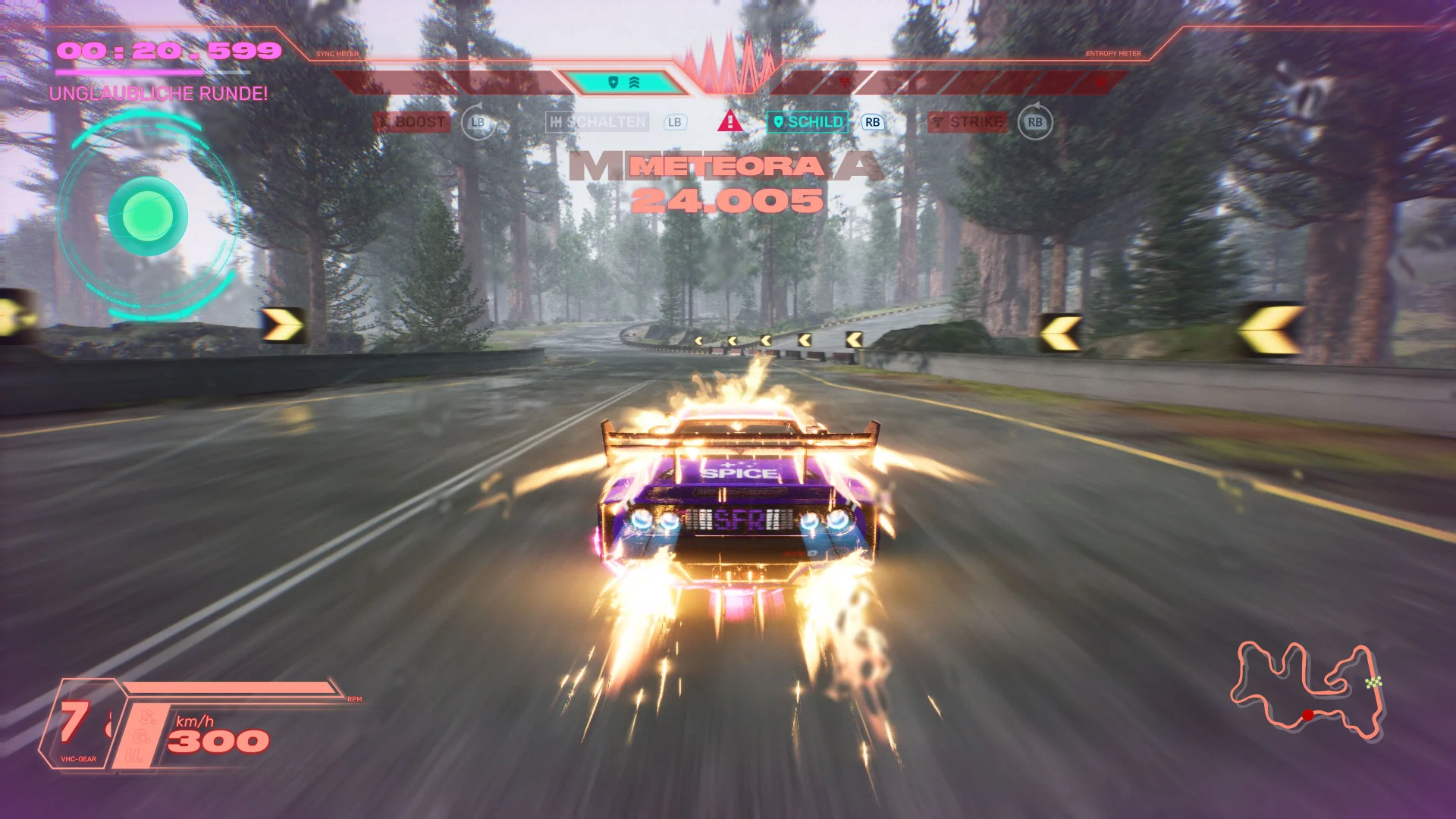 Und dann gibt es noch drei weitere Mechaniken, die auf den Namen Boost, Strike und Overdrive hören und dem Gameplay weitere Tiefe verleihen. Boost ist dabei fast schon selbsterklärend, kommt aber ebenfalls mit einem Twist daher. Prinzipiell sammeln wir mit der Zeit Energie auf, die wir dann per Tastendruck in einen Boost umwandeln können, der uns einen ordentlichen Geschwindigkeitsschub verleiht. Rufen wir diesen ab, können wir mit einem simplen Quick-Time-Event sogar einen besseren Schub erreichen, wobei sich das Timing im Eifer des Gefechts aber alles andere als einfach gestaltet.
