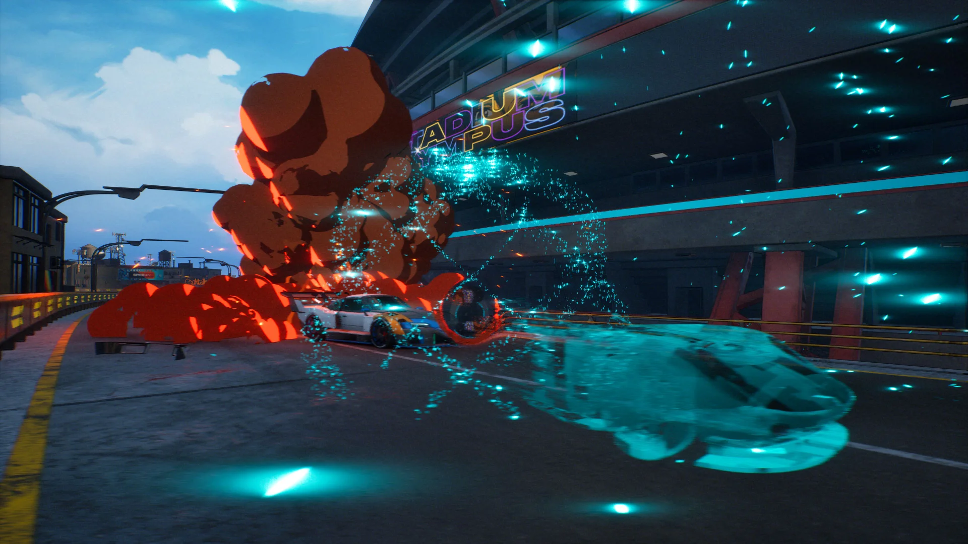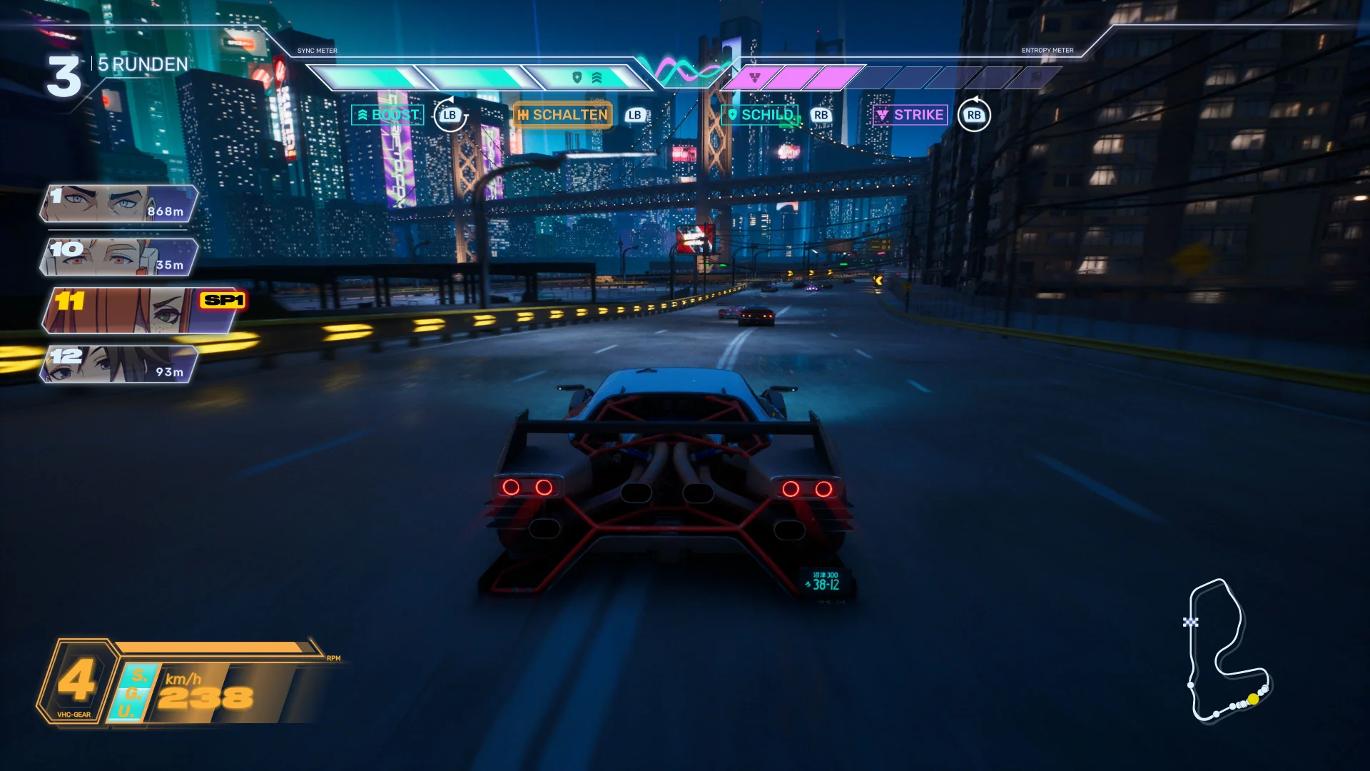 Grundsätzlich wird in Screamer automatisch geschaltet, eine vollkommen manuelle Funktion für Gangwechsel gibt es nicht. Doch halt! Tatsächlich können wir, wenn der Drehzahlmesser einen bestimmten Bereich erreicht hat, zumindest manuell hochschalten. Das verschafft uns einen kleinen Schub und füllt zudem unsere Boost-Leiste schneller auf. Ein Feature, das man also nicht unterschätzen sollte. Ebenso wichtig ist die zweite Kernmechanik, der Strike. Über einen zweiten Balken laden wir mit jedem eingesetzten Boost Energie auf, die wir bei Bedarf abrufen können. Der große Unterschied: Beim Strike verwandeln wir unseren Boliden in eine fahrende Kanonenkugel. Treffen wir in der kurzen Wirkungsdauer auf einen Widersacher, so verabschiedet sich dieser in einer beeindruckenden Explosion.