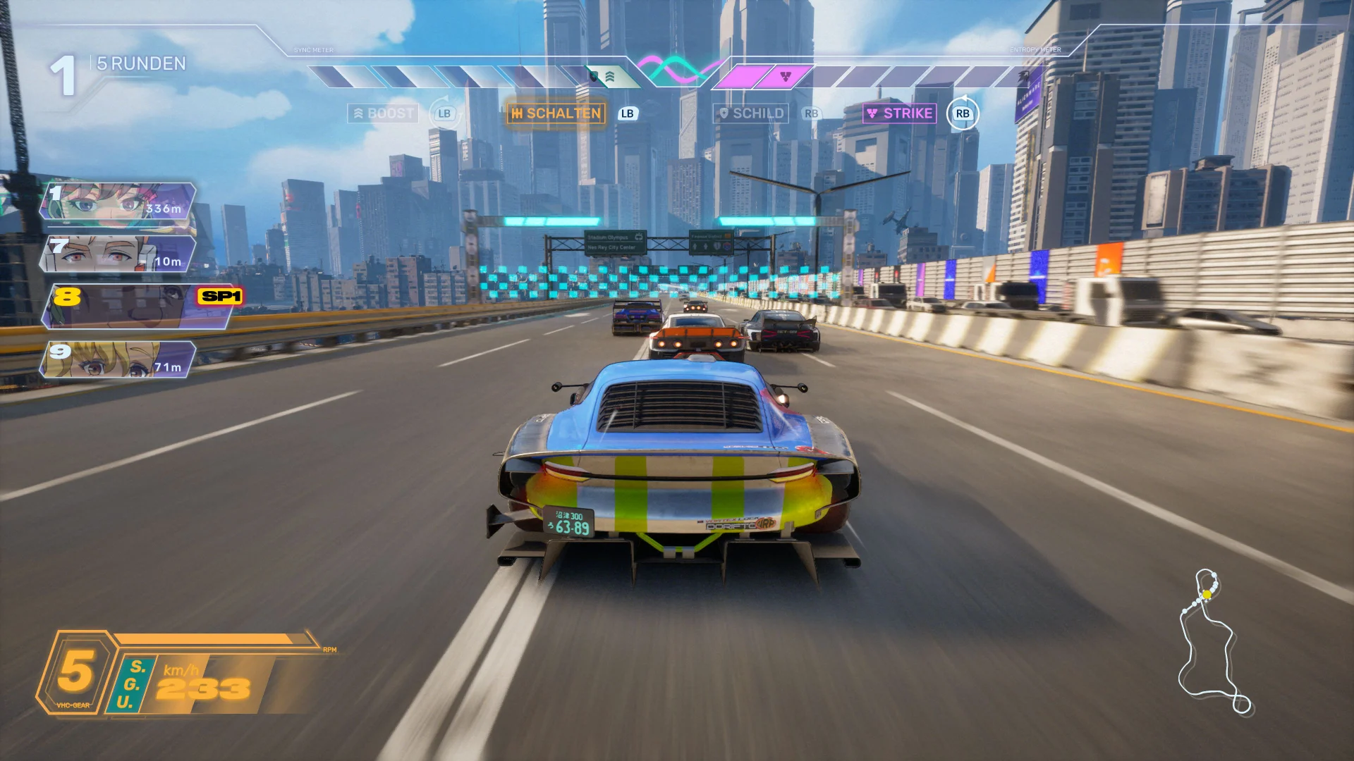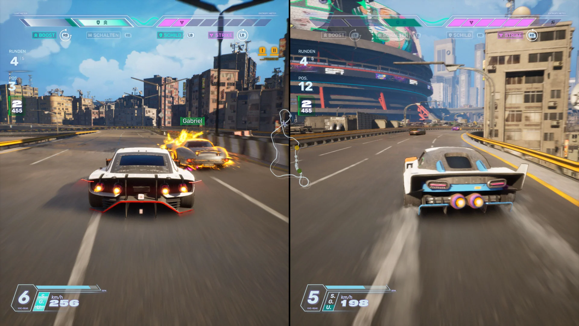 Die Wahl des Charakters und die Meisterung der einzelnen Spielmechaniken ist aber auch angebracht, denn eines sind die KI-Kontrahenten absolut nicht: Nasenbohrer. Die Jungs und Mädels wissen, wie man Gas gibt und machen selbst fleißig Gebrauch von Boost und Strike. So ergeben sich teils sehr chaotische Rennen, teils wiederum spannende Zwei- oder Dreikämpfe über mehrere Runden, die erst auf dem Zielstrich entschieden werden. Der Schwierigkeitsgrad in Screamer ist somit nicht ohne.