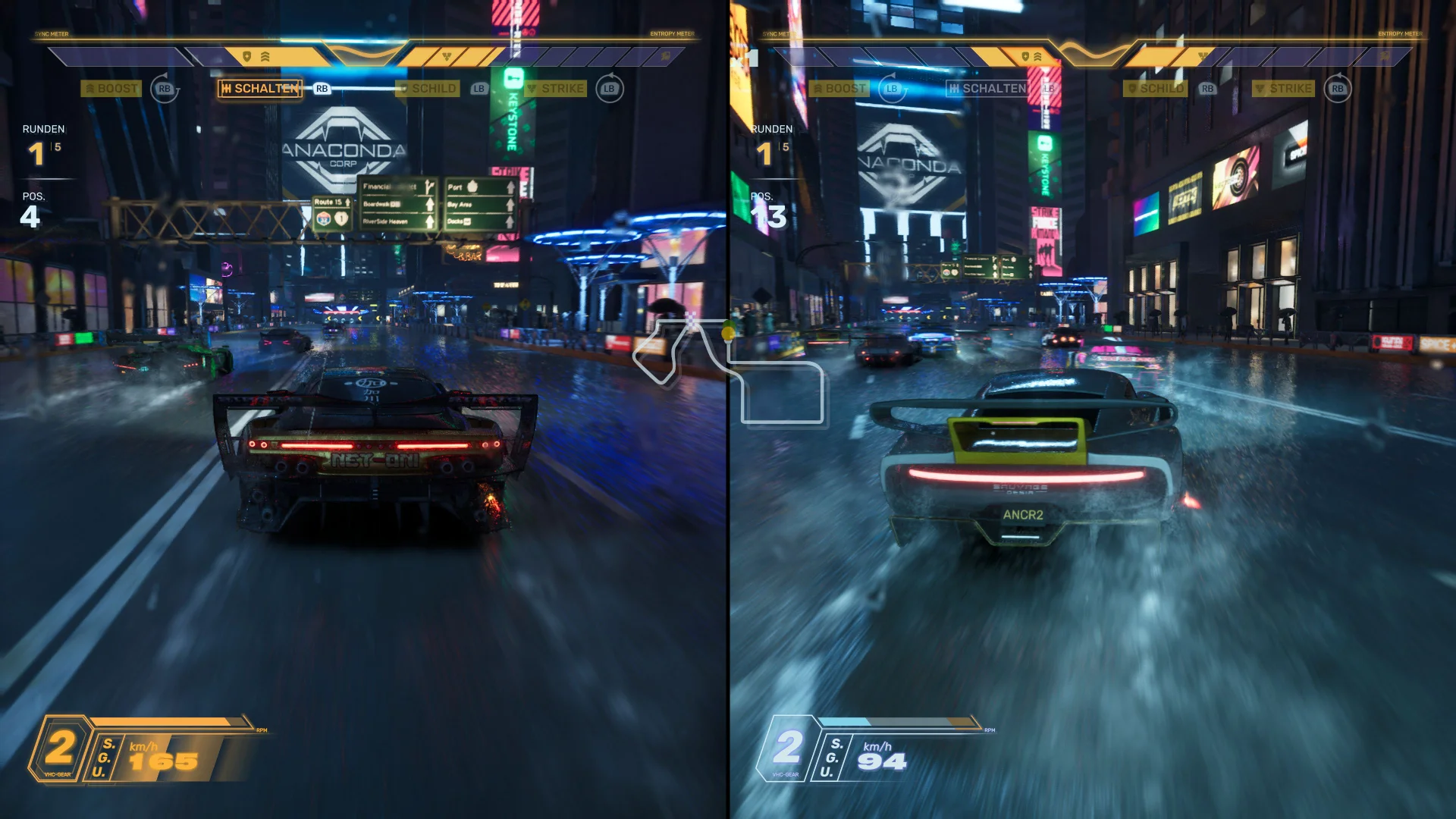 Neben dem Turnier-Modus stehen uns im Bereich Arcade weitere Optionen zur Verfügung. Wir können simple Rennen bestreiten, in Overdrive-Herausforderungen herausfinden, wie weit wir kommen oder in Checkpoint-Events auf Bestzeitjagd gehen. Milestone lässt uns im Arcade-Segment aber auch einiges an Freiheit, sodass wir eigene Rennevents gestalten können. Wir möchten ein Rennen bestreiten, ohne laufend von anderen Teilnehmern per Strike ausgeknockt zu werden? Oder wir überlegen uns ein Teamrennen, bei dem die verfeindeten Teams Green Reapers und Anaconda Corp wild zusammengewürfelt werden? Hier sind uns wirklich kaum Grenzen gesetzt, ein klares Plus für die Langzeitmotivation. Ergänzt wird der Singleplayer zudem noch durch den obligatorischen Online-Multiplayer und sogar einen Splitscreen-Modus für bis zu vier Mitspieler, bei denen wir ebenfalls zahlreiche Rahmenbedingungen anpassen können.