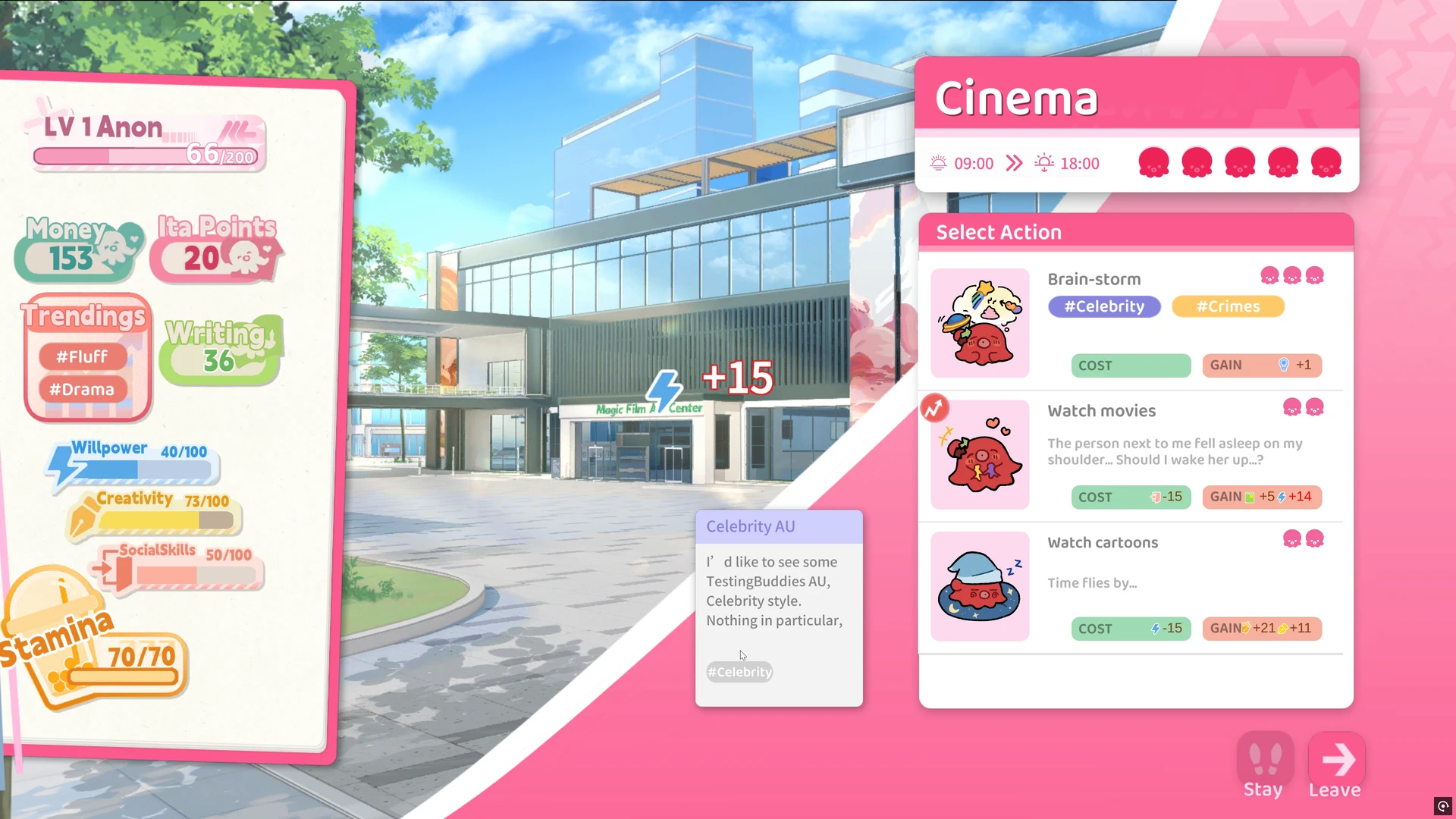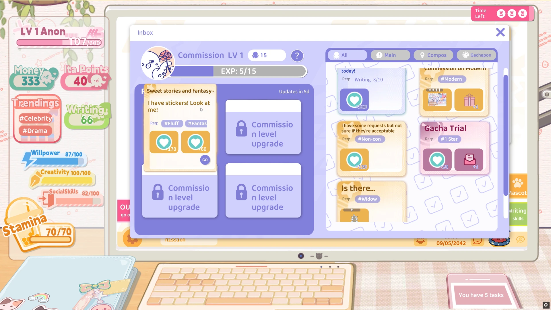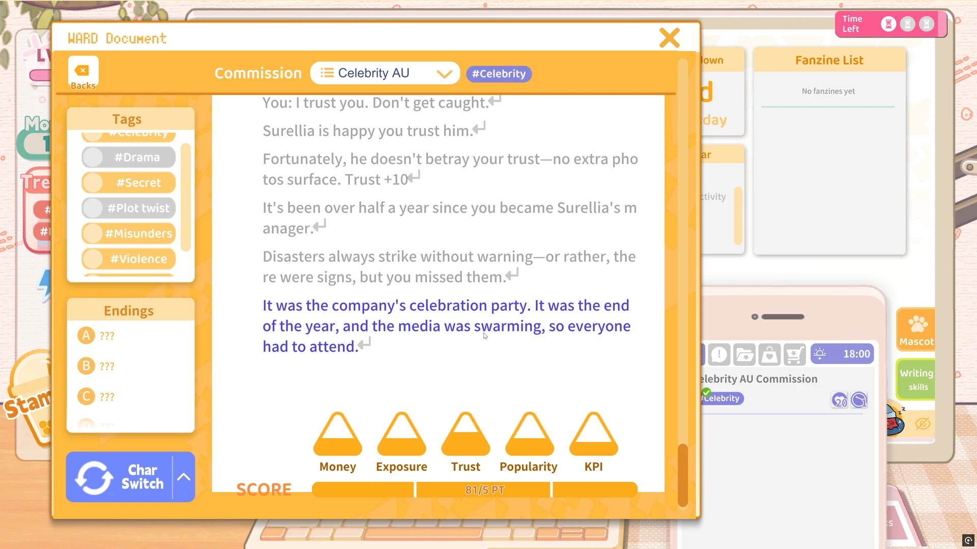 Offiziell nennt sich das Ganze „Fandom-Business-Simulation“, praktisch ist es ein Mix aus Visual Novel, Lebensverwaltung und leichtem Management. Unsere Protagonistin (festgelegt, aber visuell anpassbar) arbeitet tagsüber an Inspiration, erledigt Nebenjobs, trifft Mitfans – abends stellt sie aus Genre-Tags und gesammelten Ideen ihre Geschichten zusammen und veröffentlicht sie als Fanzines. Das Schreiben ist dabei weniger Tastaturakrobatik, mehr kuratierte Komposition – ein System, das die Fantasie befeuert, ohne uns mit Texteditoren zu erschlagen. Dabei überwiegt klar der Visual-Novel-Anteil, während die Management-Elemente für Abwechslung und Spieltiefe sorgen.