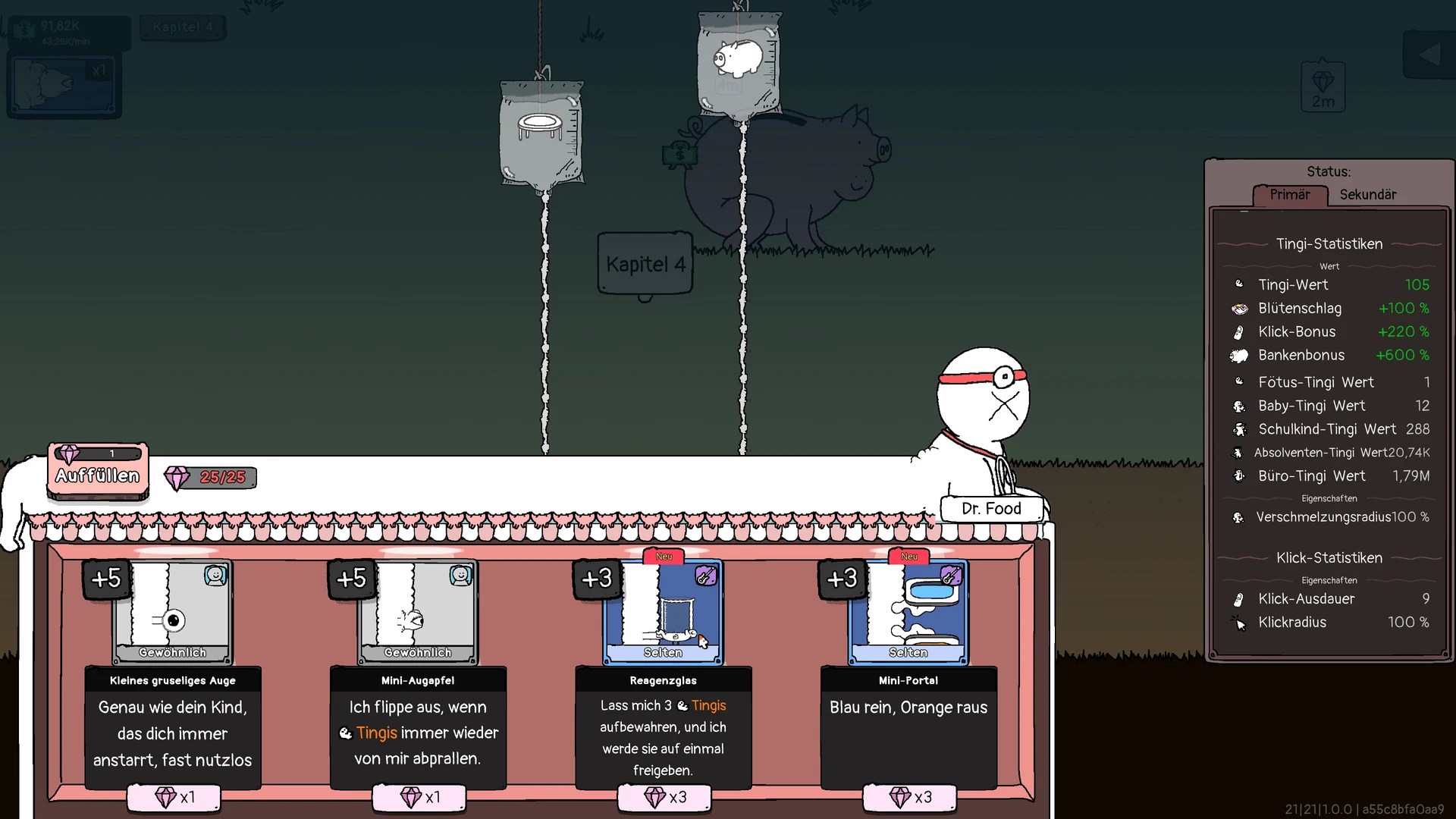 Die Präsentation ist gleichzeitig verstörend und faszinierend. Die Kombination aus cartoonhaftem Körperhorror und liebevoll gestalteter Weirdness macht das Spiel unverwechselbar. Die Mechaniken sind klar strukturiert, die Upgrades sinnvoll und motivierend, die Abläufe logisch und befriedigend. Der Fortschritt wird im späteren Spielverlauf zwar langsamer, doch das verstärkt den Fokus auf Optimierung und Planung.