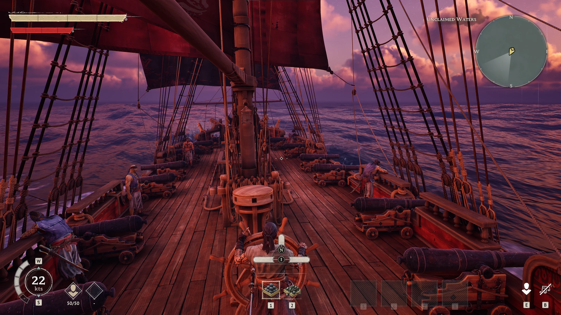 Nachdem wir das passende Wrack endlich erreicht haben, gilt es, haufenweise Ressourcen zu sammeln, um das stattliche Segelschiff wieder flott zu machen. Hierfür benötigen wir außerdem die Unterstützung unserer alten Crew, die, wie wir erfahren haben, in einem nahe gelegenen Piratenlager gefangen gehalten wird. Ist die Mannschaft befreit, können wir endlich unser eigenes Schiff fertig stellen und wenig später zu Wasser lassen. Jetzt beginnt der Spaß erst richtig, denn im Gegensatz zum mickrigen Beiboot fliegt das große Segelschiff deutlich schneller über den Ozean und lässt uns die Karte schnell und komfortabel erkunden. Auf dem Schiff wimmelt es dabei vor eifrigen Crewmitgliedern, die die verschiedenen Stationen des Schiffs eigenständig bedienen und dabei für eine authentische Atmosphäre auf hoher See sorgen. Als Kapitän stehen wir natürlich am Steuerrad, dürfen natürlich aber auch auf oder unter Deck herum flanieren oder auch das Lager des Schiffs verwalten.
